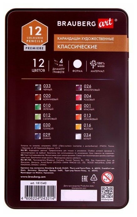 Цветные художественные карандаши BRAUBERG ART PREMIERE предназначены для художественного оформления, в котором важна чёткость линий и яркость цвета. Высокое качество грифеля позволяет достичь насыщенности и равномерности цвета по всей поверхности рисунка.