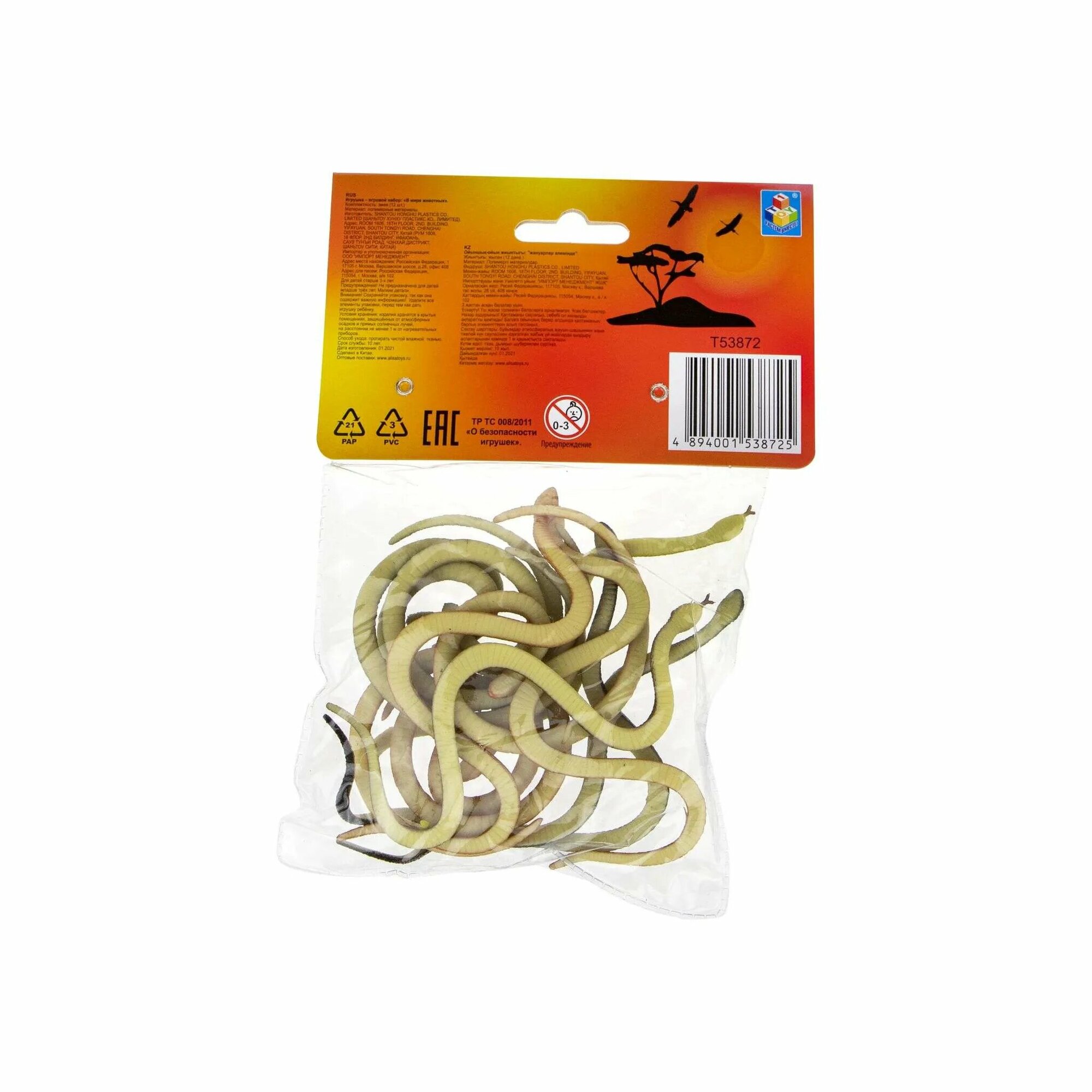 "Змеи" 12 штук пакет с европодвесом (Т53872) 1toy В мире животных змеи 12шт.пакет с хед.18х14х2,5см.
