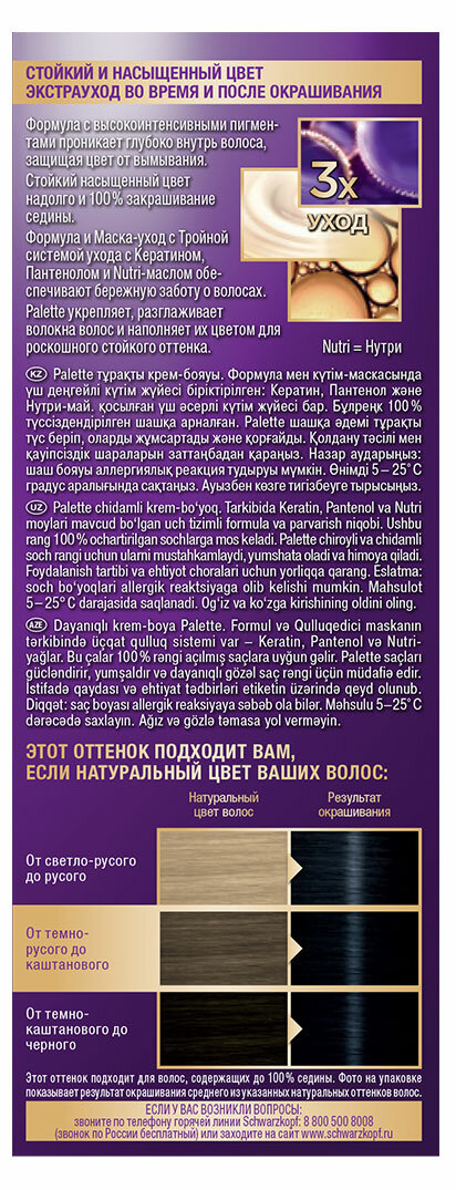 Формула с высокоинтенсивными пигментами проникает глубоко внутрь волоса, защищая цвет от вымывания. Стойкий насыщенный цвет надолго и 100% закрашивание седины. Формула и маска-уход с тройной системой ухода с кератином, пантенолом и nutri-маслом обеспечивают бережную заботу о волосах. Palette укрепляет, разглаживает волокна волос и наполняет их цветом для роскошного стойкого оттенка.