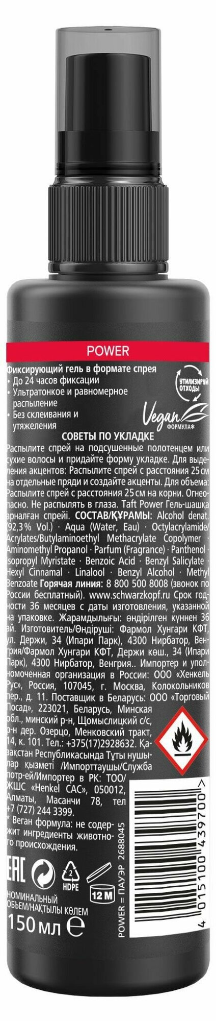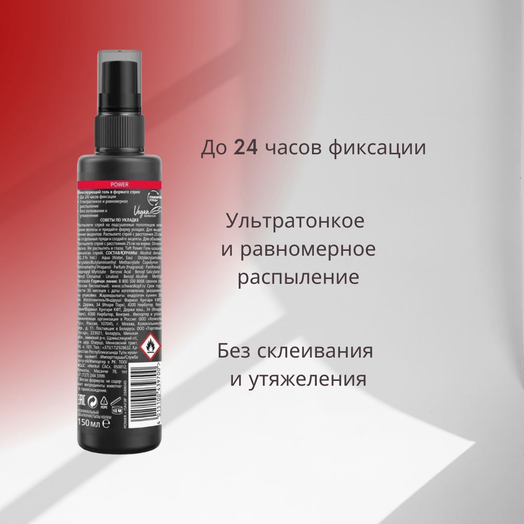 | Полное наименование | Гель-спрей для волос Taft Power Сверхсильная Фиксация 150 мл |