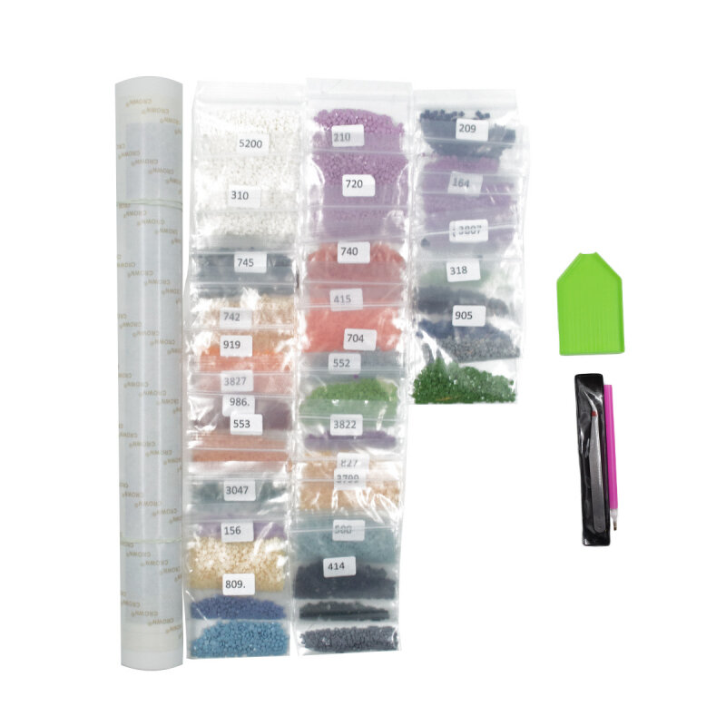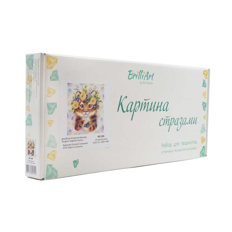 | Комплектация | холст с клеевым слоем и нанесенной схемой, акриловые стразы (9 граней) в пакетиках, стилус, пинцет, контейнер, силиконовая подушечка, инструкция. |