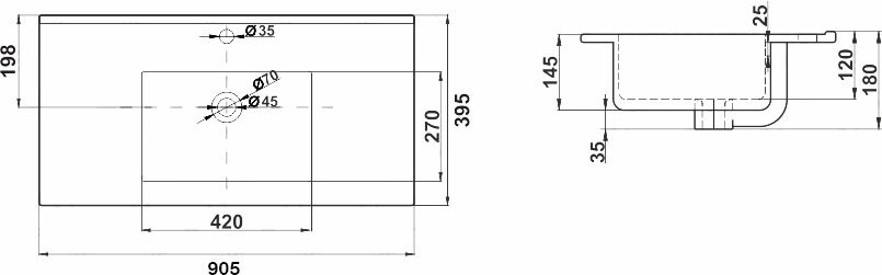 Ширина: 910. Глубина: 395. Высота: 180. Форма прямоугольная. Отверстие под перелив есть. Отверстие под смеситель есть. Тип раковины: столешница. Цвет: белый