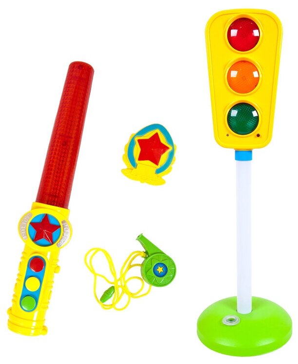 Игровой набор из серии "Потеша". Игрушка имеет два режима работы:1. Стихи и поговорки; 2. Цвета светтофора. Весёлые мелодии, яркая подсветка. Светофор работает от 3-х батареек типа "АА" ( в комплект не входят). В набор входят аксессуары дорожного полицейского: свисток, жетон и жезл регулировщика. Жезл работает от 3-х батареек типа "АА" ( в комплект не входят).