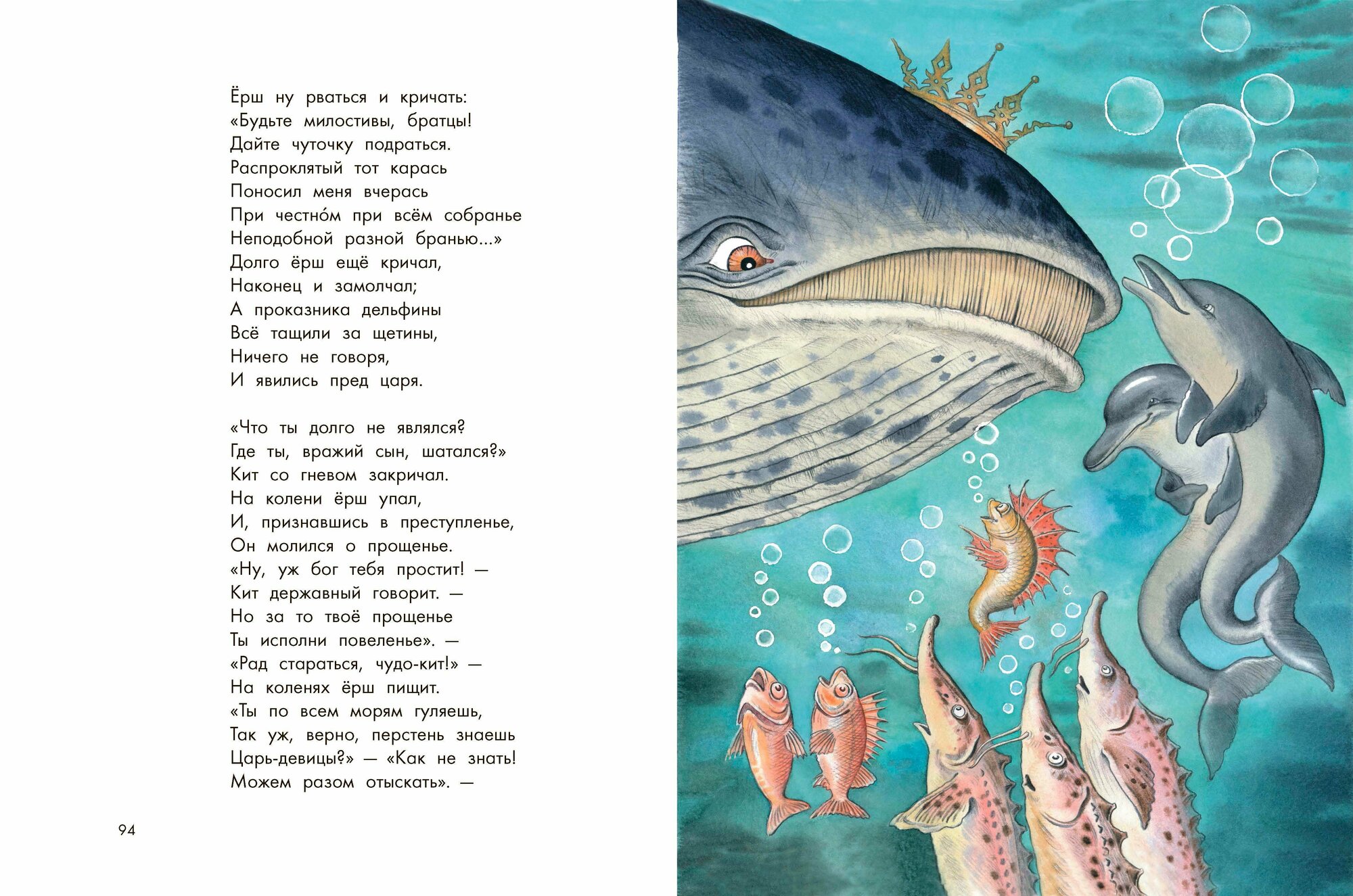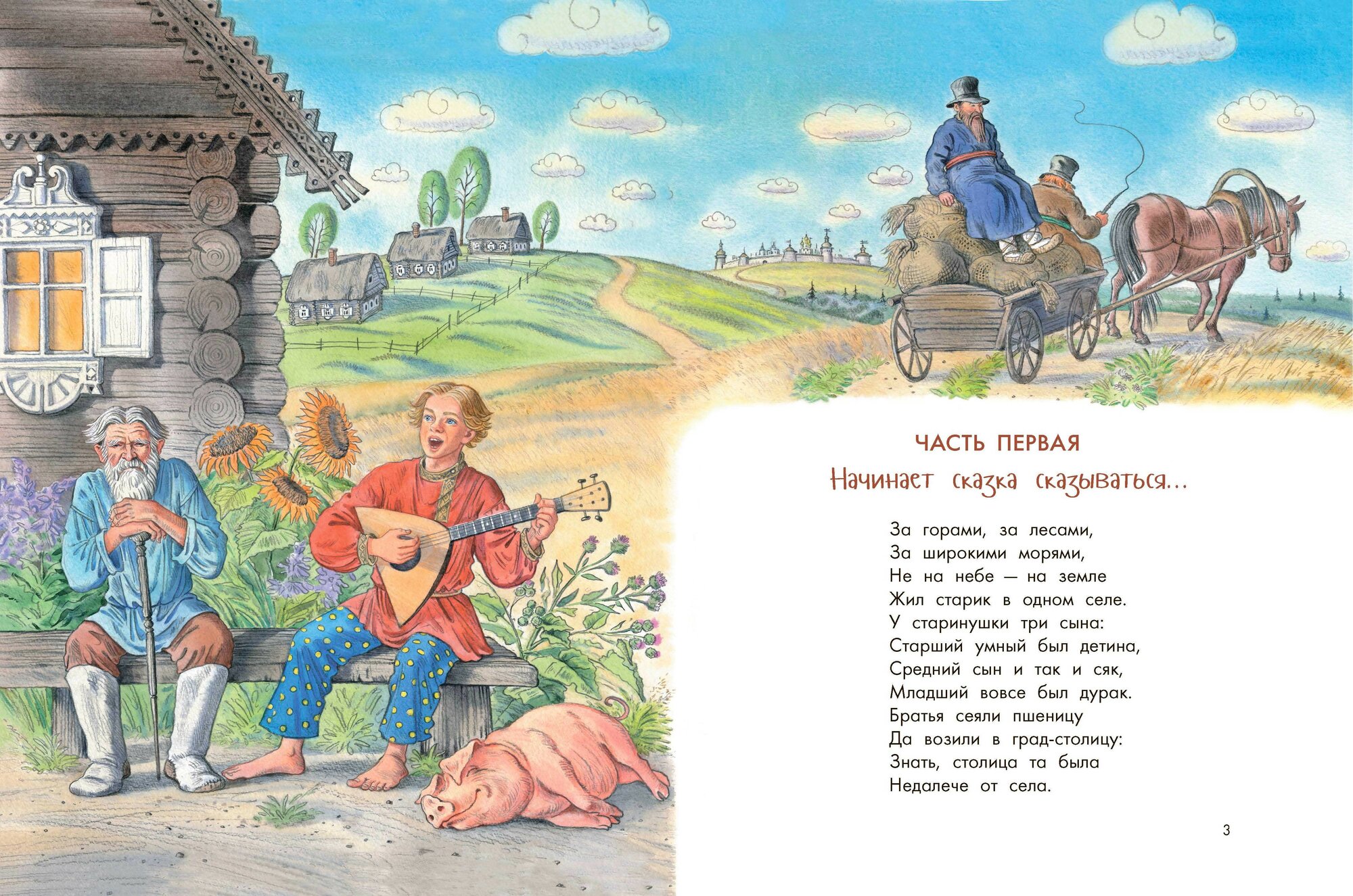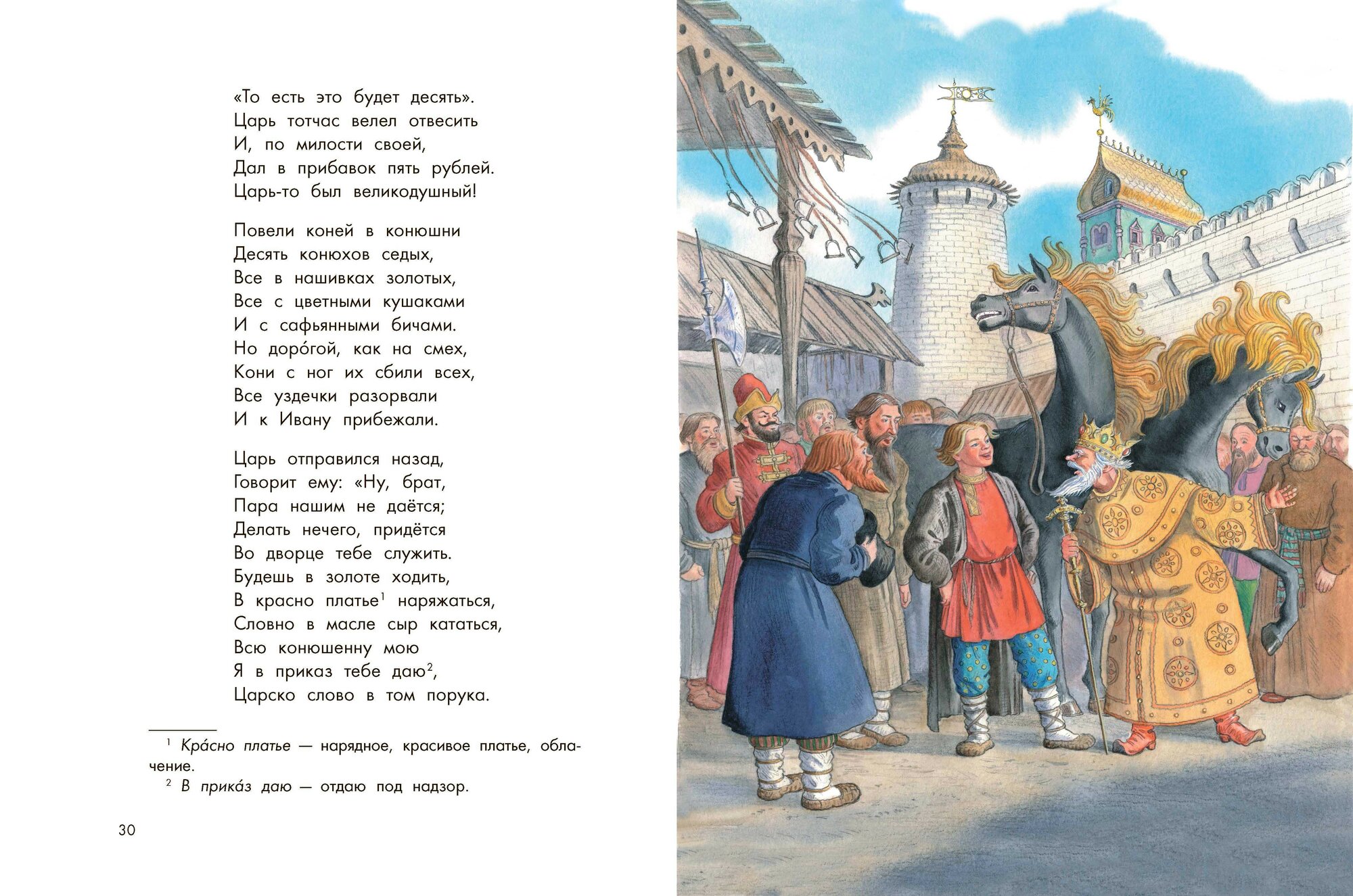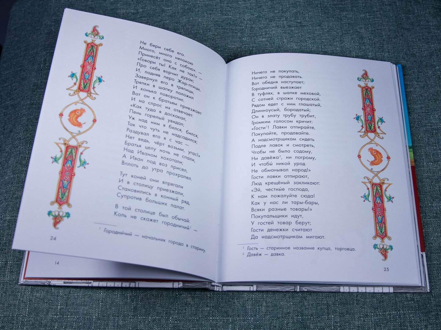 А мы вернёмся к книге. Издательство "Качели" снова радует своим выбором художника. Мне очень понравились иллюстрации Елизаветы Вединой. С одной стороны это детализация всех сказочных образов, колоритность в передаче бытовых сцен, внимание к эмоциям героев, а с другой именно некая гипертрофированная мультяшность в каждом рисунке, в лицах героев. И это привлекает внимание ребёнка. Сам текст имеет сноски, словарик малоупотребляемых, вышедших из обихода речи внизу страницы. Не теряется канва в чтении. А таких слов в сказочном стихосложении очень много, текстовые строки изобилуют простонародными, славянскими говорами, обозначениями мер длины, названиями чужеземными (принужусь* - понадоблюсь, Немские страны - иноземные страны, рядиться - уговаривать)...