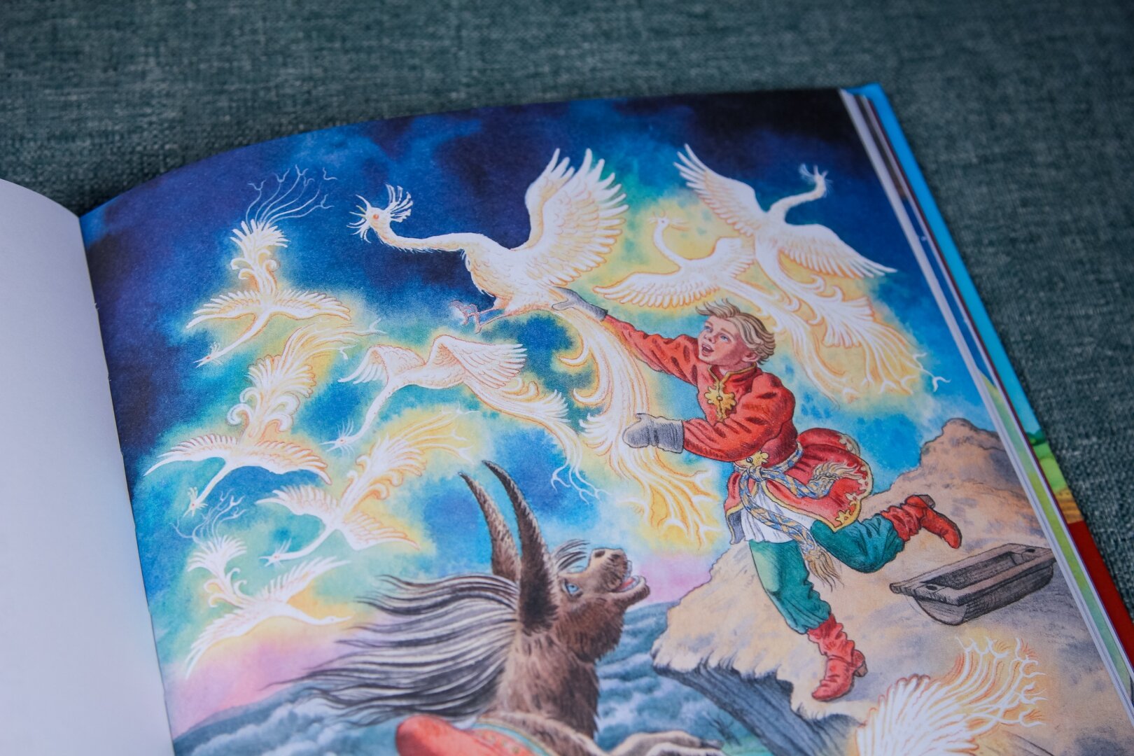 Кроме того, все мы помним, что Иванушка выполняет несколько приказов и каждый случай акцентирует внимание на ключевых моментах - появлением орнаментов на страницах (они не на каждой странице, а по всему тексту рассыпаны). Первые орнаментальные узоры появляются с описанием ловли волшебной кобылицы, затем с появлением конька-горбунка и прекрасных скакунов, которых украли братья у Иванушки. Позже это будет перо Жар-Птицы, сама диковинная Жар-Птица, Царь-девица, встреча с Чудо-Юдом Рыбой-Китом и Месяцем Месяцовичем и перстень прекрасной Царь-девицы...