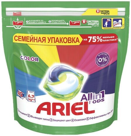 Невероятная чистота в одной маленькой капсуле! Капсулы для стирки Ariel Pods Всё-в-1 для цветного имеют уникальный многосекционный дизайн, позволяющий надежно сохранять компоненты в отдельных секциях капсулы до начала стирки, и обладают высококонцентрированными очищающими свойствами. Инновационная пленка капсул для стирки Ariel полностью растворяется при контакте с водой, позволяя мощным технологиям удалять различные виды пятен. Одна капсула содержит необходимую для стирки дозу лучшего жидкого средства от Ariel для безупречного отстирывания и яркости цвета. Благодаря уникальным технологиям и природным энзимам в составе, Ariel Всё в 1 прекрасно отстирывает сложные пятна даже при температуре 20°C. Капсулы ARIEL PODS сочетают в себе все необходимые свойства для эффективной стирки: 1. Очищают 2. Выводят пятна 3. Придают яркость 4. Освежают 5. Эффективны при 20°C. преимущества ARIEL PODS ВСЁ В 1: - Невероятная чистота в одной капсуле для стирки - Обеспечивает безупречное отстирывание и яркость цвета - Превосходная чистота даже при 20°C - Простота использования: не нужно отмерять и наливать Так как капсулы не содержат кондиционера, для дополнительной мягкости и яркости белья используйте Lenor: он защищает одежду от появления катышков и потери формы и потери цвета. Теперь ваши любимые вещи прослужат вам дольше. Безопасность превыше всего! Мы не используем фосфаты или хлор и постоянно совершенствуем формулы наших продуктов, изучая и тестируя каждый ингредиент на предмет безопасности и безопасной дозировки при ежедневном применении. Все активные компоненты полностью биоразлагаемы. Храните упаковки капсул в месте, недоступном для детей. Для более мягкого аромата, попробуйте коллекцию Ariel аромат масла ши. Если у вас чувствительная кожа, рекомендуем обратить внимание на гипоаллергенную коллекцию Ariel для чувствительной кожи.