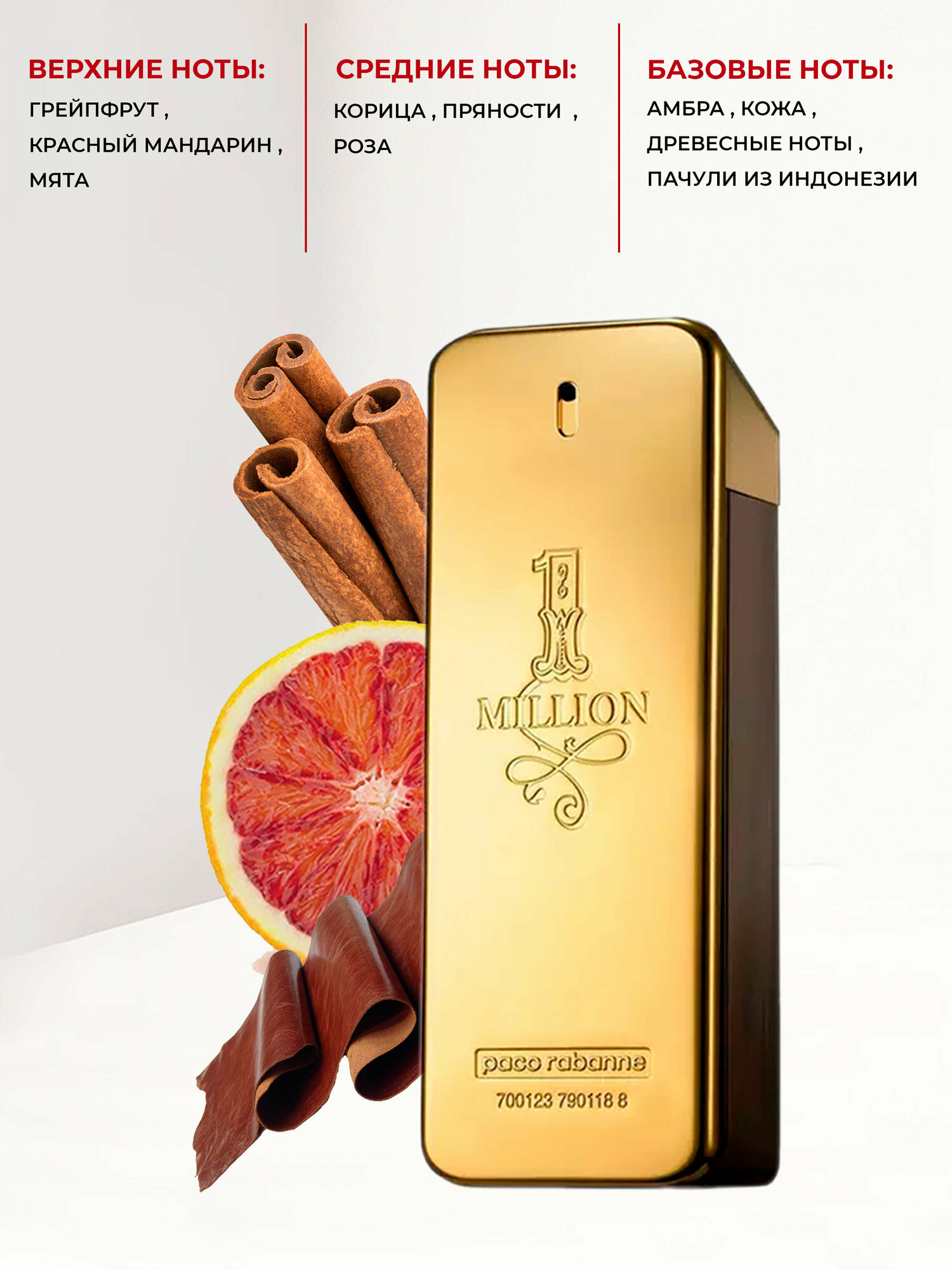 Аромат One Million обращается к образам, заставляющим мечтать: блестящие машины, погони за сокровищами или красивыми девушками. удовольствия, желания, все, что сверкает и вызывает головокружение. Без комплексов и с наслаждением. С неоспоримой долей юмора герой One Million использует свое очарование и даже злоупотребляет им, чтобы в одно мгновение добиться всего того, чего он всегда желал. One Million - это настоящая парфюмерная симфония! Сначала - радостная серия ярких и искрящихся нот: свежесть грейпфрута,