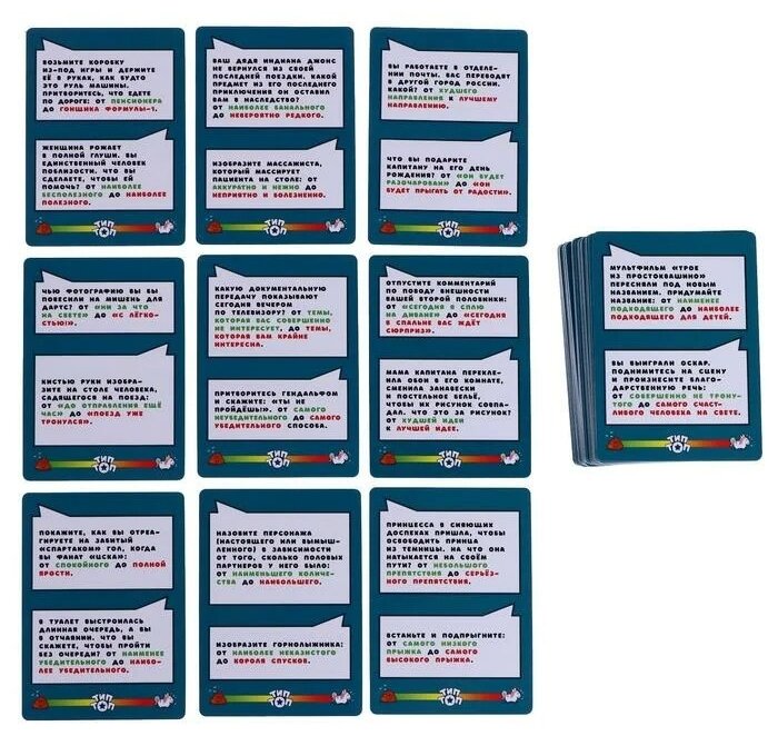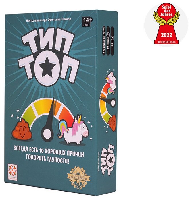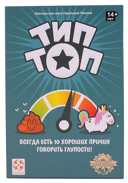 Вы со своими друзьями на одной волне? Проверьте это на деле! Тип-Топ - это кооперативная игра (все участники играют в одной команде). В каждом раунде капитан берёт верхнюю карту с темами, выбирает одну из них и зачитывает ее вслух. Задача игроков - дать ответ, соответствующий номеру на карте (от 1 до 10). Но всё не так просто! Капитан должен расположить ответы в порядке возрастания. Тут нужно подумать! Сложная задача, не так ли? Теперь проверьте свои способности!