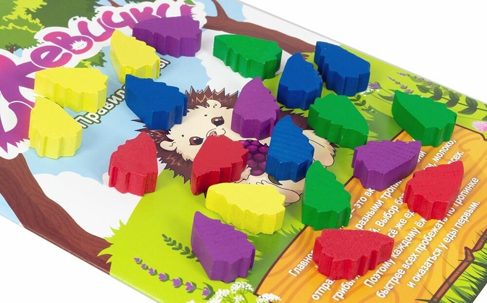 В игре 20 деревянных фигурок ежей и тканевое игровое поле. Приятные тактильные ощущения и красивые книжные иллюстрации создают уютную атмосферу. Ежевички, пожалуй, самая подходящая игра для игры на природе, на даче или зимним вечером, когда хочется вспомнить лето.