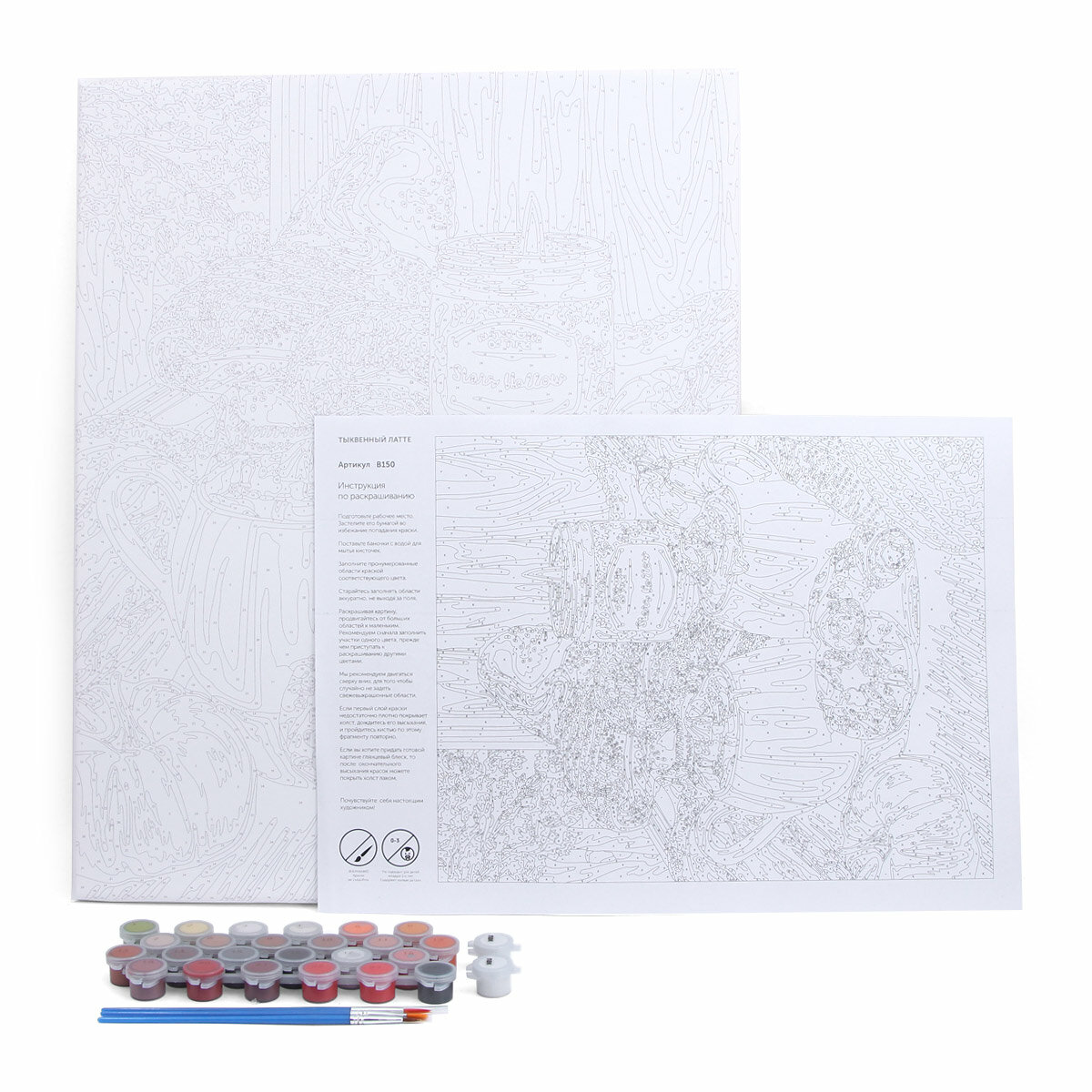 | Комплектация | Холст на деревянном подрамнике; Нейлоновые кисти 3 шт.; Акриловые краски (матовые) |