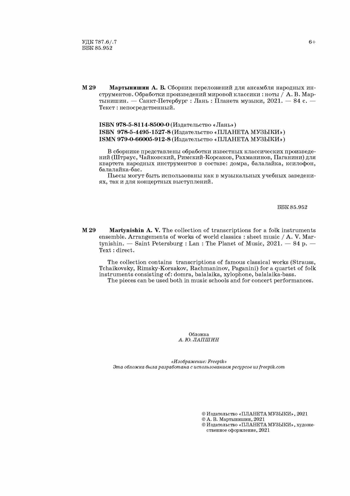 Сборник переложений для ансамбля народных инструментов. Обработки произведений мировой классики (А. В. Мартынишин); Издательство «Планета музыки», 2021