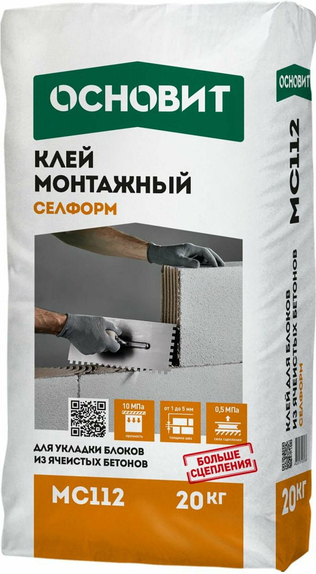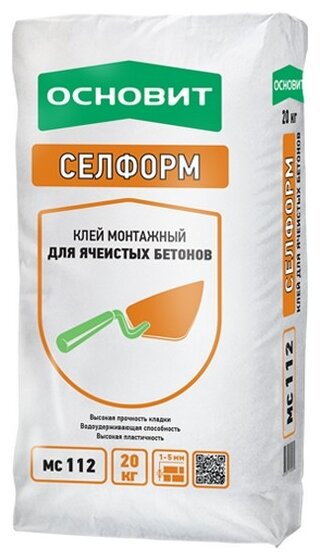 Клей монтажный Основит Селформ МС112 предназначен для кладки стен и перегородок из блоков и плит на основе ячеистого бетона (пено- и газобетон), газосиликата и силиката. Используется для тонкослойной кладки пазовых и беспазовых блоков. Для внутренних и наружных работ.