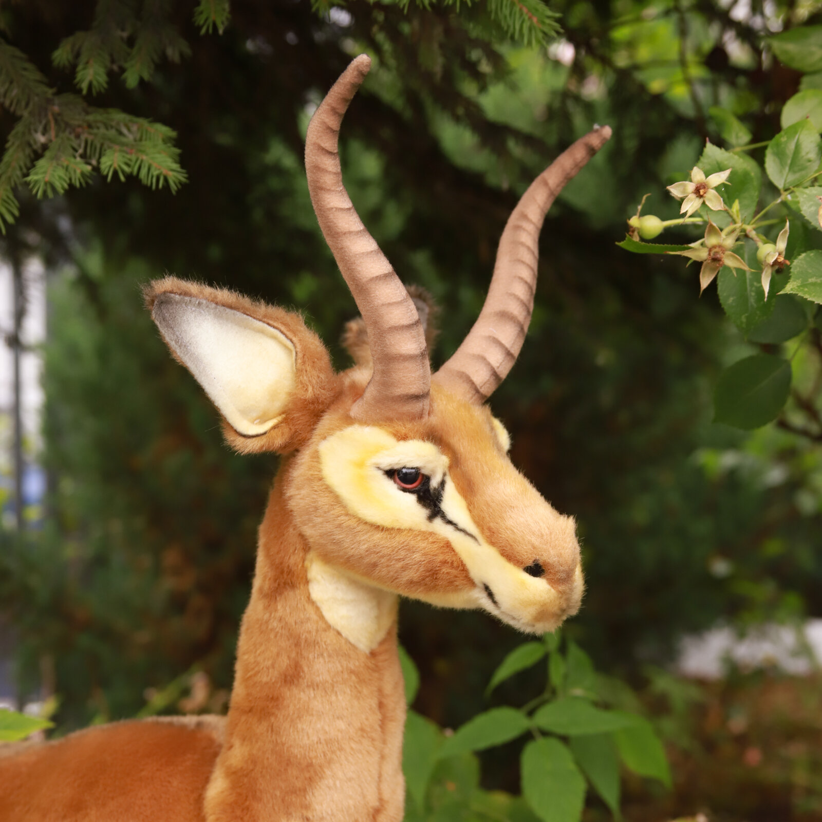 Мягкая игрушка Газель от компании Hansa Creation высотой 70 см до кончиков рогов выглядит точной, хотя и уменьшенной копией настоящего животного. Внутренний каркас придает изделию устойчивость и стать природного прототипа. Густой шелковистый мех, сходный по фактуре и окрасу с шерстяным покровом животного, ласкает прикосновениями. Упругие рога, изящные ушки и доверчивый взгляд лани довершают сходство игрушки с обитателем африканских саванн. Газель украсит интерьер, станет прекрасным реквизитом для игр и фотосессий.