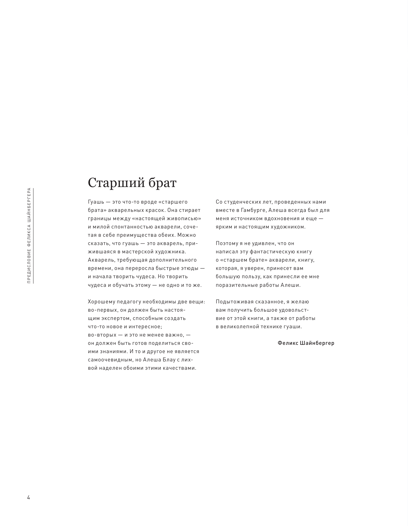 Когда открыла и увидела предисловие, написанное Феликсом Шайнбергером, очень удивилась и обрадовалась - Феликс плохого не порекомендует! :) И эта книга читается так же легко, как книги про акварель и иллюстрацию Шайнбергера. Стиль повествования у них очень схож, на мой взгляд. И стиль этот прекрасен: познавательно, интересно, ни капельки не скучно, вдохновляюще! Алёша Блау как будто берёт вас за руку и ведёт в волшебный мир гуаши, с любовью о ней рассказывая. -