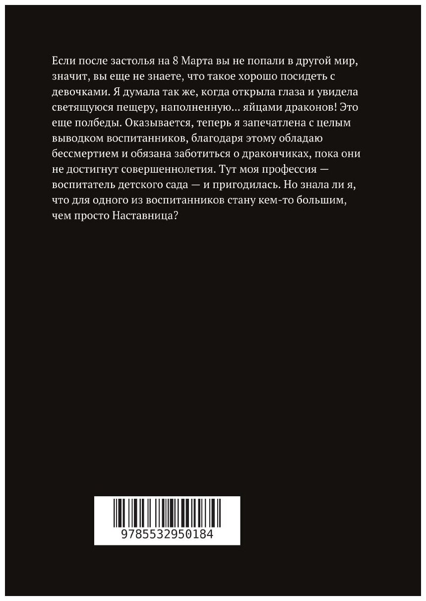 Если после застолья на 8 Марта вы не попали в другой мир, значит, вы еще не знаете, что такое хорошо посидеть с девочками. Я думала так же, когда открыла глаза и увидела светящуюся пещеру, наполненную… яйцами драконов! Это еще полбеды. Оказывается, теперь я запечатлена с целым выводком воспитанников, благодаря этому обладаю бессмертием и обязана заботиться о дракончиках, пока они не достигнут совершеннолетия. Тут моя профессия – воспитатель детского сада – и пригодилась. Но знала ли я, что для одного из воспитанников стану кем-то большим, чем просто Наставница?