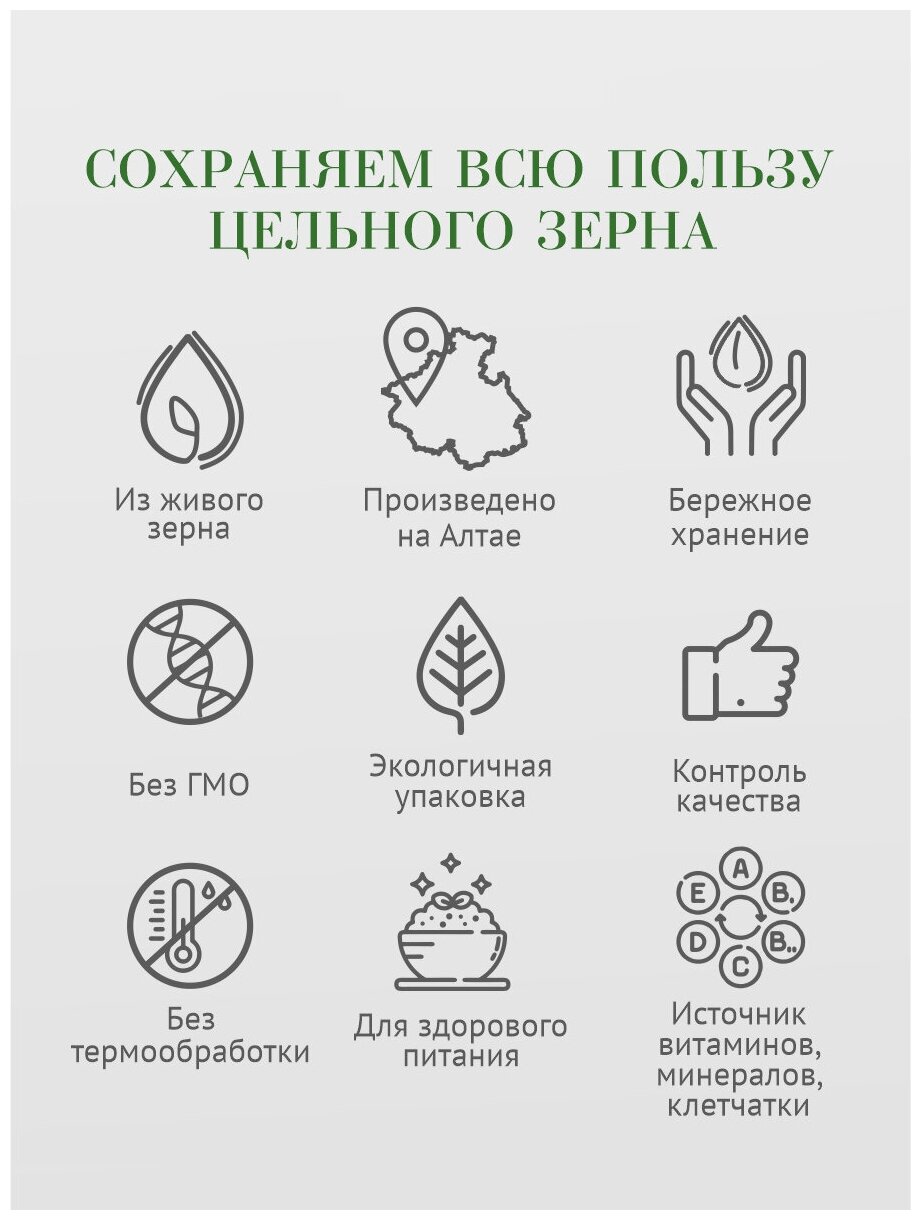 Цельнозерновая гречневая мука из термически необработанной зеленой гречки сохраняет весь комплекс полезных витаминов и микроэлементов. Мука из зеленой гречки содержит витамины B, PP, марганец, железо, цинк, медь. Также мука гречневая зеленая используется и в косметологии, из нее делают разнообразные питательные маски, нежные скрабы для кожи. Цельносмолотая гречневая мука используется в кулинарии для приготовления лепешек, тортов, хлебцев, каш, соусов. Гречневую муку рекомендуют употреблять для усиления иммунитета детям, а также для снижения риска развития сахарного диабета. На завтрак можно приготовить питательный коктейль с добавлением гречневой муки на основе молока (или овсяного, миндального молока). Вегетарианский продукт, подходит для постных рецептов, для правильного, диетического питания. Подходит для хлеба, выпечки булочек, пирожков, пирогов и блинов, для цельнозернового печенья, пирожных и кексов. Гречневый хлеб - безглютеновый продукт, который чаще всего готовят с такой мукой. Также она часто используется как блинная мука. Универсальная мука. В рецептах с тестом эту муку можно смешивать с другими видами муки, такими как - ржаная, пшеничная или полбяная. Выпечка с добавлением цельносмолотой муки приобретает особенный аромат и яркий насыщенный вкус. Правильное питание. Постоянное употребление муки из цельного живого зерна способствует бесперебойной работе пищеварительной системы, усилению иммунитета и обогащению организма питательными веществами. Подходит для диетического питания и для безглюиеновой диеты. Цельнозерновая мука незаменима среди полезных вегетарианских продуктов, занимает почетное место на полке правильных ПП продуктов и бакалеи для здорового питания, постного меню (можно в пост). Подходит для многих веган - блюд. Все для полезной и вкусной выпечки, алтайские натуральные продукты без ГМО, химической обработки, эко продукты для здорового рациона вы найдете на странице нашего магазина. Блюда из цельнозерновой муки - это здоровая и вкусная еда для детей, женщин и мужчин. Гречневая мука - недорогой и доступный по цене натуральный питательный продукт. Важно не путать, мука высшего сорта (сортовая мука) и мука цельнозерновая - разные продукты. Цельнозерновая мука более ценная в питательном отношении по сравнению с мукой сортового помола. В ней содержится весь набор питательных элементов зерна. Без глютена в составе, но может содержать следы глютена, кунжута и сои от других продуктов на производстве. В составе - алтайская зеленая гречка, не прошедшая термическую обработку и сохранившая всю пользу зерна. Выбирайте фасовку удобную для вас - 500 г , 1 ,5 кг или мешок 5 кг.