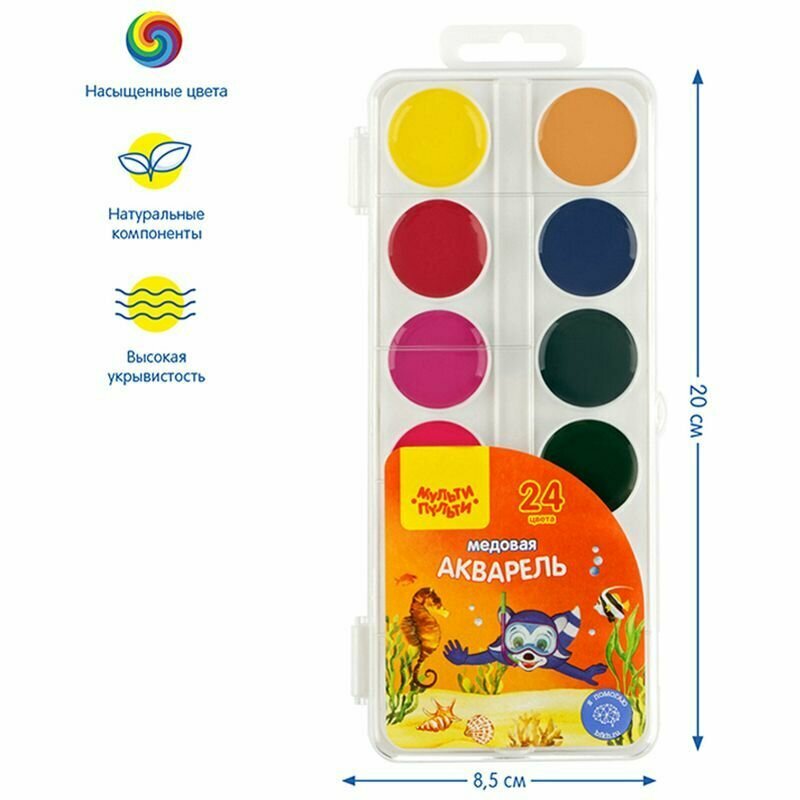 Краски Мульти-Пульти обладают хорошей укрывистостью и остаются яркими при высыхании. Смешивание акварели Мульти-Пульти дает чистые оттенки. Натуральные компоненты делают ее безопасной для здоровья детей. Пластиковая упаковка акварели удобна в использовании. Для детей старше 3-х лет.