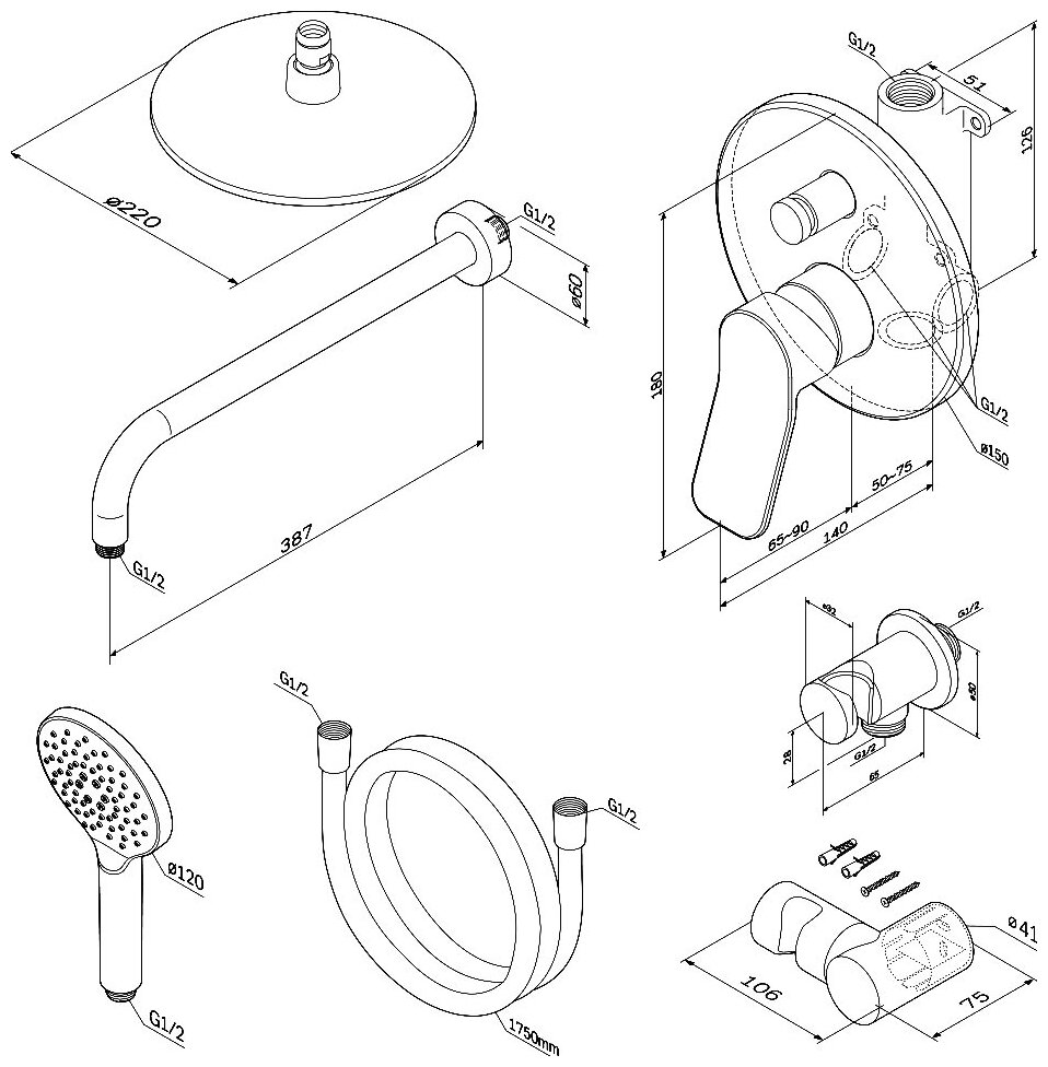 | Оснащение | Душевая лейка / Шланг для душа / Держатель душа / Кронштейн для верхнего душа / Шланговое подключение / Скрытая монтажная часть / Верхний душ / Смеситель |