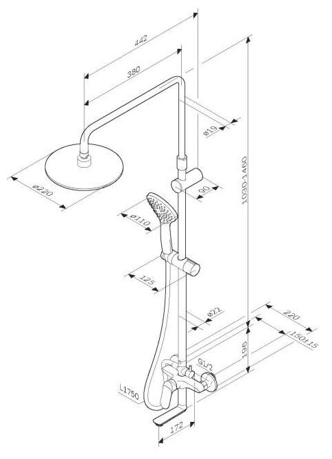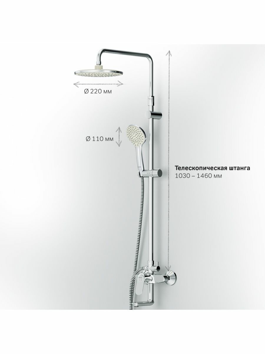 | Вылет верхнего душа | 44.2 см (от стены до центра верхней лейки) |