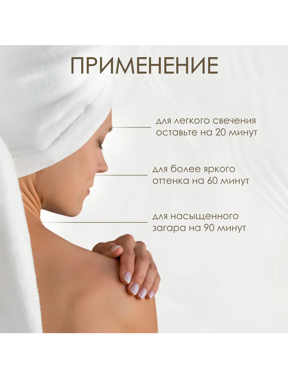 Круговыми движениями нанесите продукт на чистую сухую кожу лица и тела сухой рукавичкой. Обработайте кисти рук и ступни ног остатками средства на рукавичке. Подождите от 20 до 90 минут в зависимости от желаемого оттенка. В этот период не мочите кожу. Смойте средство. Загар проявится в течение нескольких часов.
