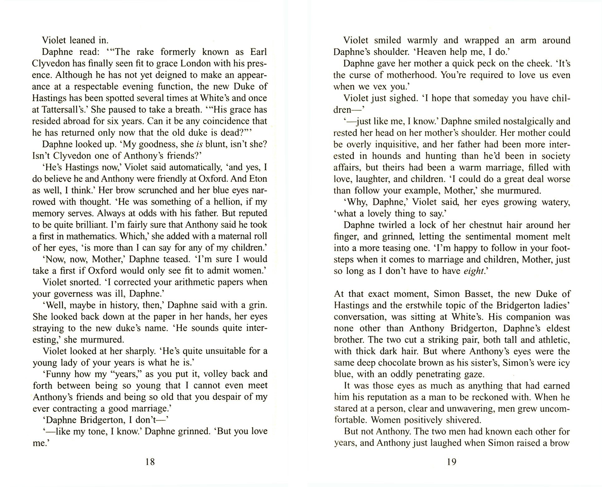 By all accounts, Simon Basset is on the verge of proposing to his best friend's sister, the lovely - and almost-on-the-shelf - Daphne Bridgerton. But the two of them know the truth - it's all an elaborate plan to keep Simon free from marriage-minded society mothers. And as for Daphne, surely she will attract some worthy suitors now that it seems a duke has declared her desirable . . .