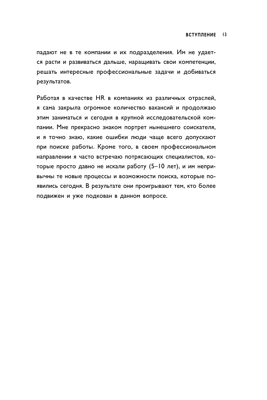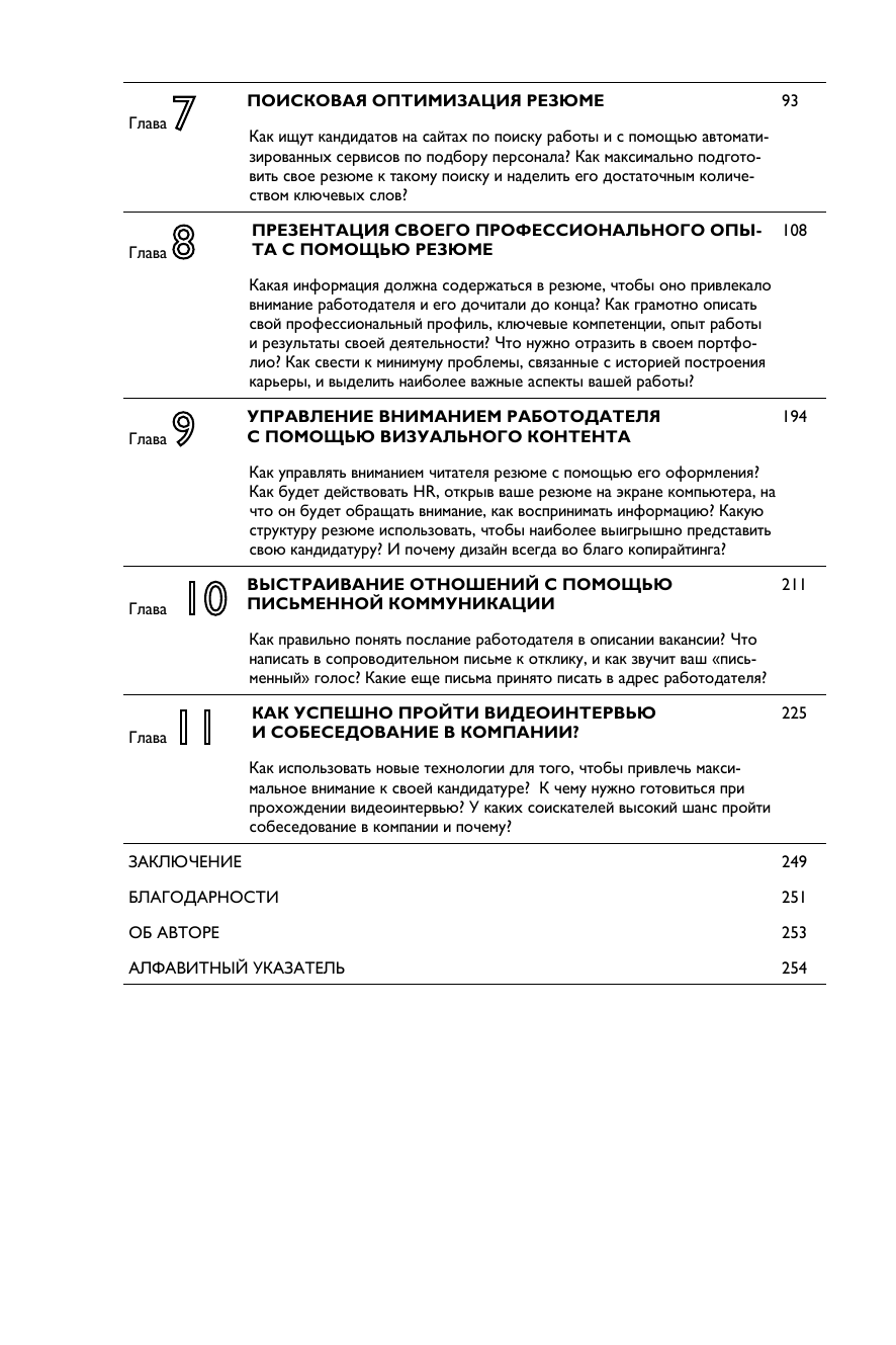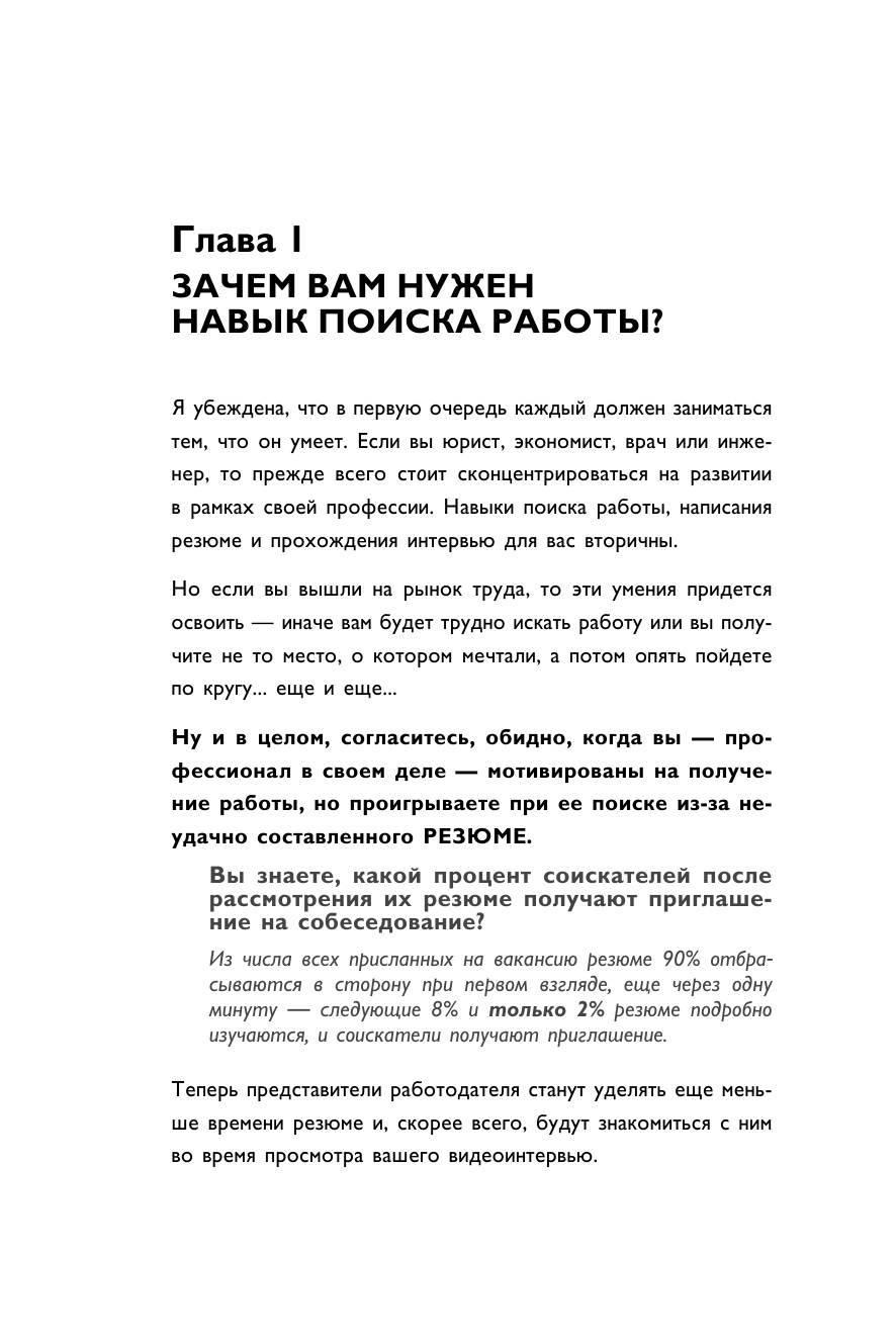 Рекомендую книгу как тем, кто находится в поиске работы, так и тем, кто уже работает и хочет больше узнать о трендах на рынке труда. Подойдет также тем, кто обдумывает смену карьеры. Прочитанное заставляет задуматься о некоторых неочевидных вещах, которые могут помочь в поиске работы, например, о приобретении навыка говорить на камеру - полезный момент при возрастающей популярности видео-резюме и видео-интервью. Существенная часть книги направлена на подготовку резюме и прохождение собеседований. В книге даны практические задания, полезные шаблоны, приводятся ссылки на исследования рынка труда на российском материале. Автор уделяют вниманию умению презентовать себя, поиску своих сильных сторон - по словам автора - своего УТП - уникального торгового предложения, которое поможет вам выделиться на фоне конкурентов. Автор предлагает свой подход к составлению резюме, формат которого она называет комбинированным, в отличии от стандартного резюме, которые встречаются на сайтах по поиску работы. Мне кажется, эта книгу будет полезна и сотрудникам отделов персонала.