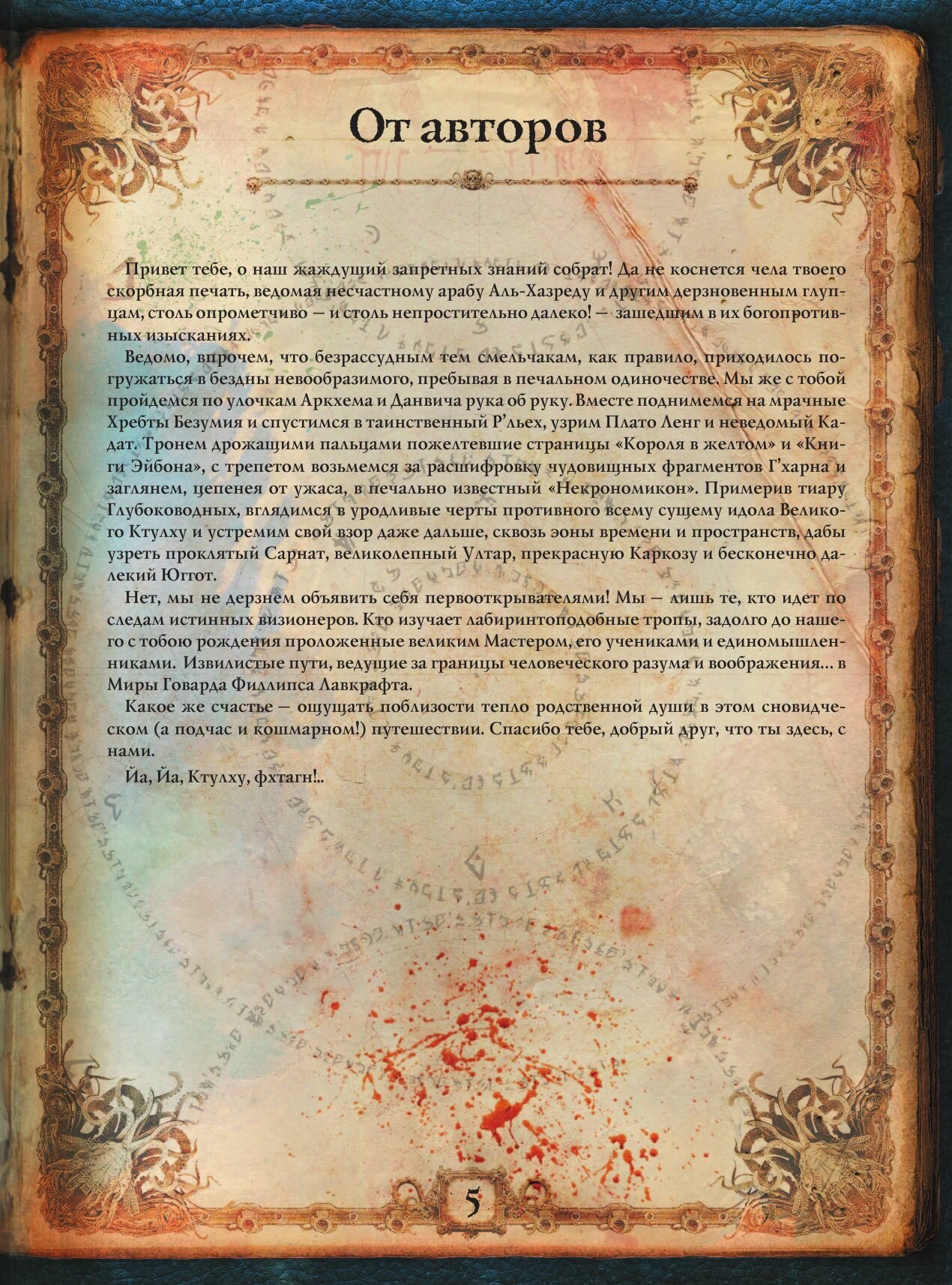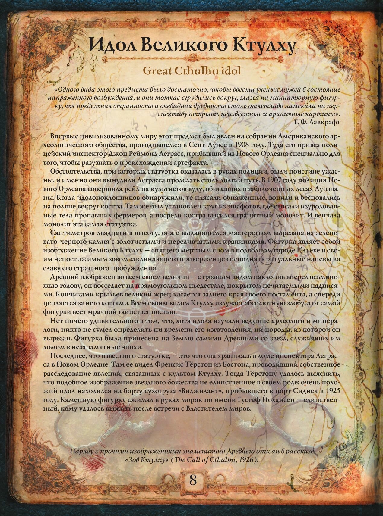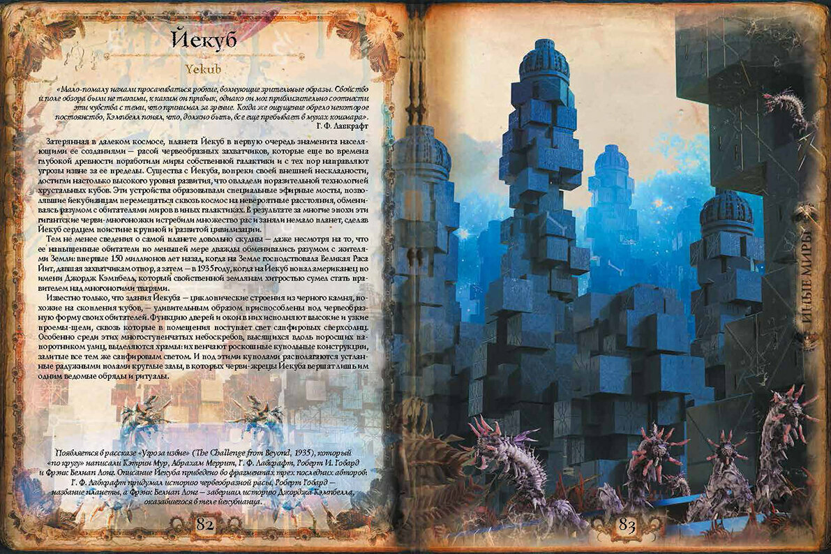 В этой книге, являющей собой подробный, богато иллюстрированный альбом-справочник, писатели, редакторы, художники и специалисты по творчеству Лавкрафта и его последователей рассказывают и показывают локации и артефакты, иные миры и запретные труды, составляющие значимую часть "вселенной Лавкрафта" и так называемых Мифов Ктулху.