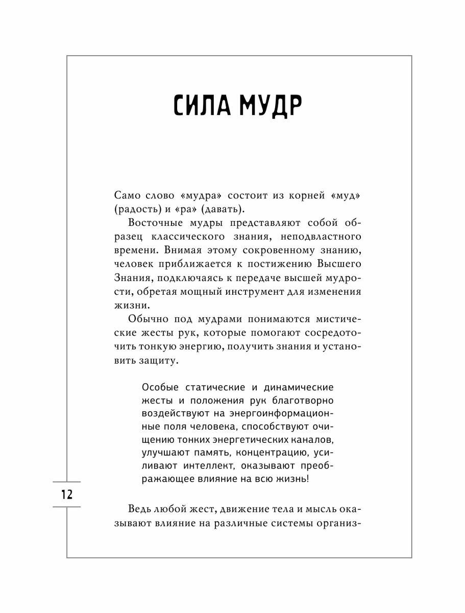 Когда что-то не получается, лучший способ получить желаемое это обратиться к мудрам. Всё очень просто - складываем руки особым образом и восстанавливаем правильную циркуляцию энергии в теле. В книге даны чёткие инструкции и фотографии огромного количества разных мудр на разные жизненные ситуации. И они действительно работают! Рекомендую всем!