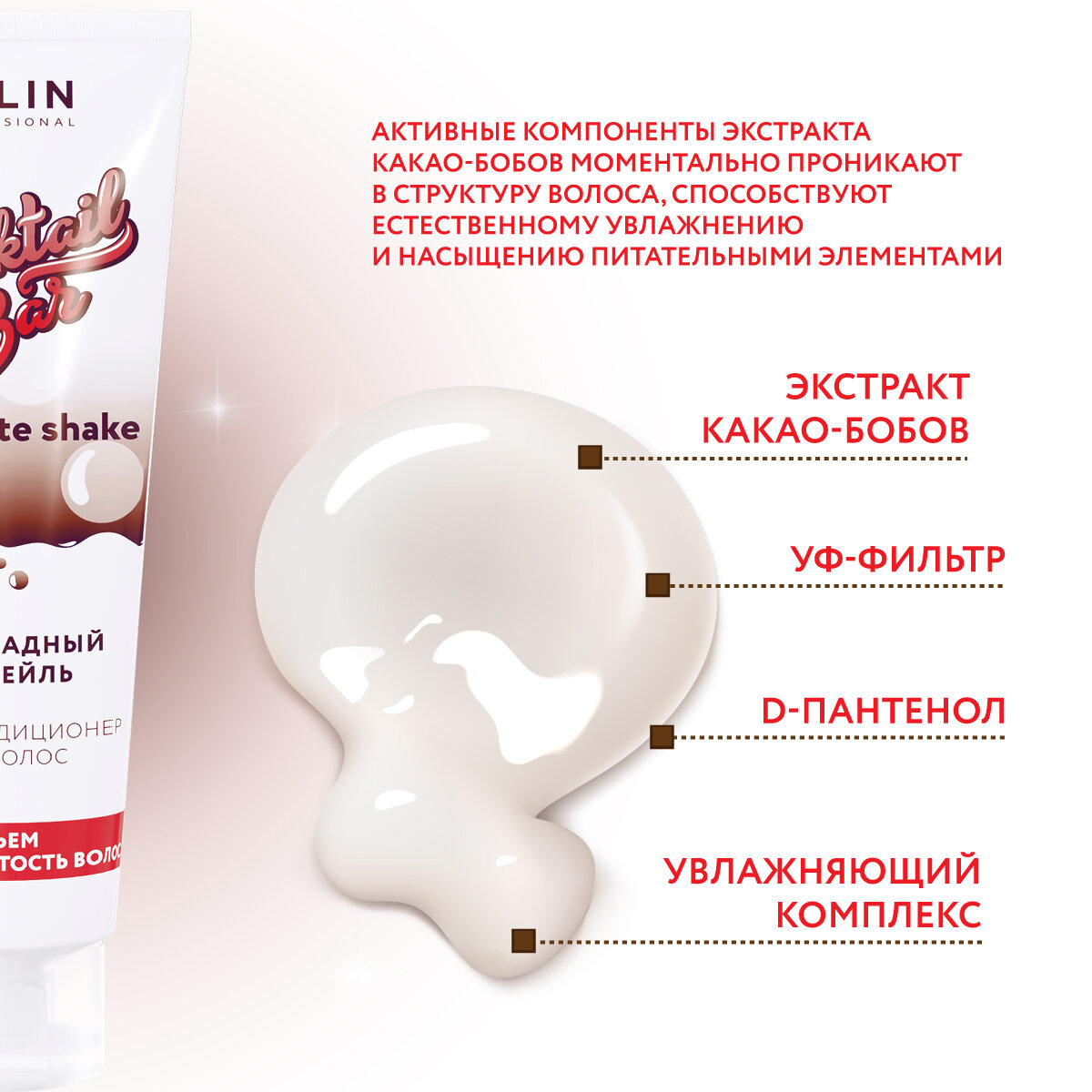| Химический состав | Aqua, Myristyl Alcohol, Bis-Hydroxy/Methoxy Amodimethicone, Behentrimonium Chloride, Glycerin, Propylene Glycol, Cetrimonium Chloride, Theobroma Cacao Extract, Na-PCA, Pantenol, Ethylhexyl Methoxycinnamate, Parfum, Citric Acid, Methylchloroisothiazolinone, Methylisothiazolinone, Benzyl Benzoate, Linalool. |