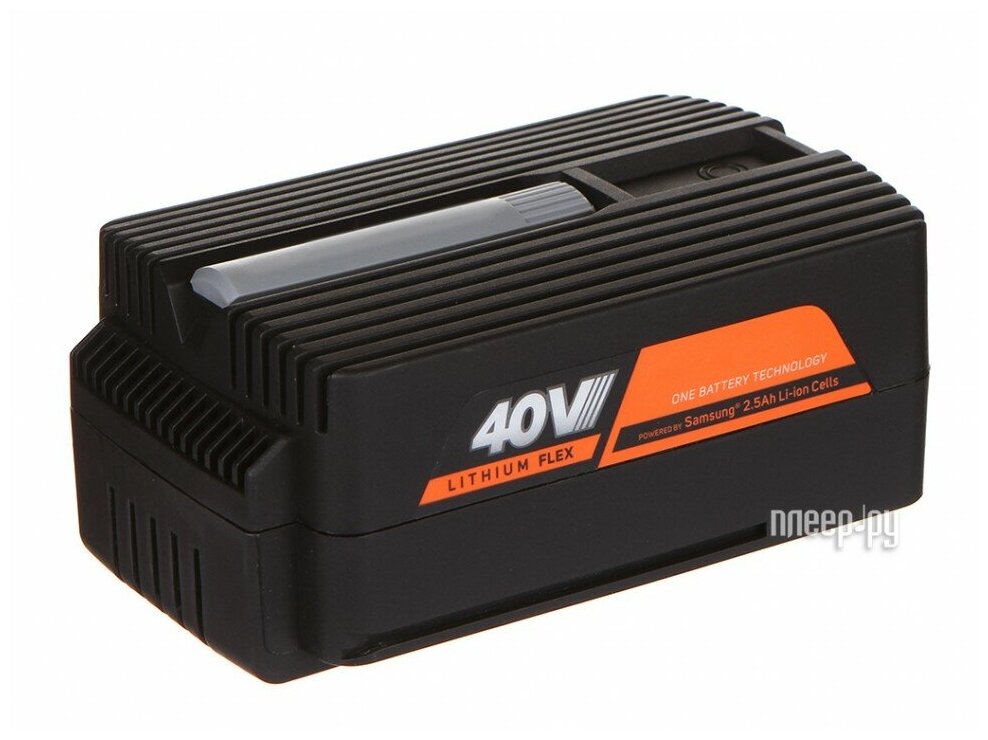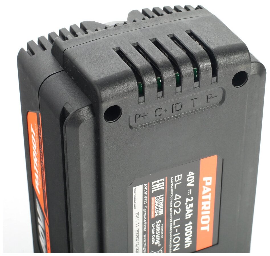 Li-Ion аккумулятор с элементами от "Samsung". Устанавливается на аккумуляторный садовый инструмент Patriot с рабочим напряжением 40 Вольт. На аккумуляторе установлен светодиодный индикатор степени заряда.