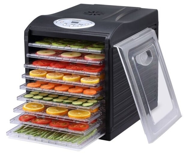 Мощности спокойно хватает высушить все как фрукты с овощами, так и вялить мясо и рыбу. В использовании простая и удобная, вся панель управления находится спереди на верхней части корпуса. Просушивает отлично на каждом поддоне и работает тихо.