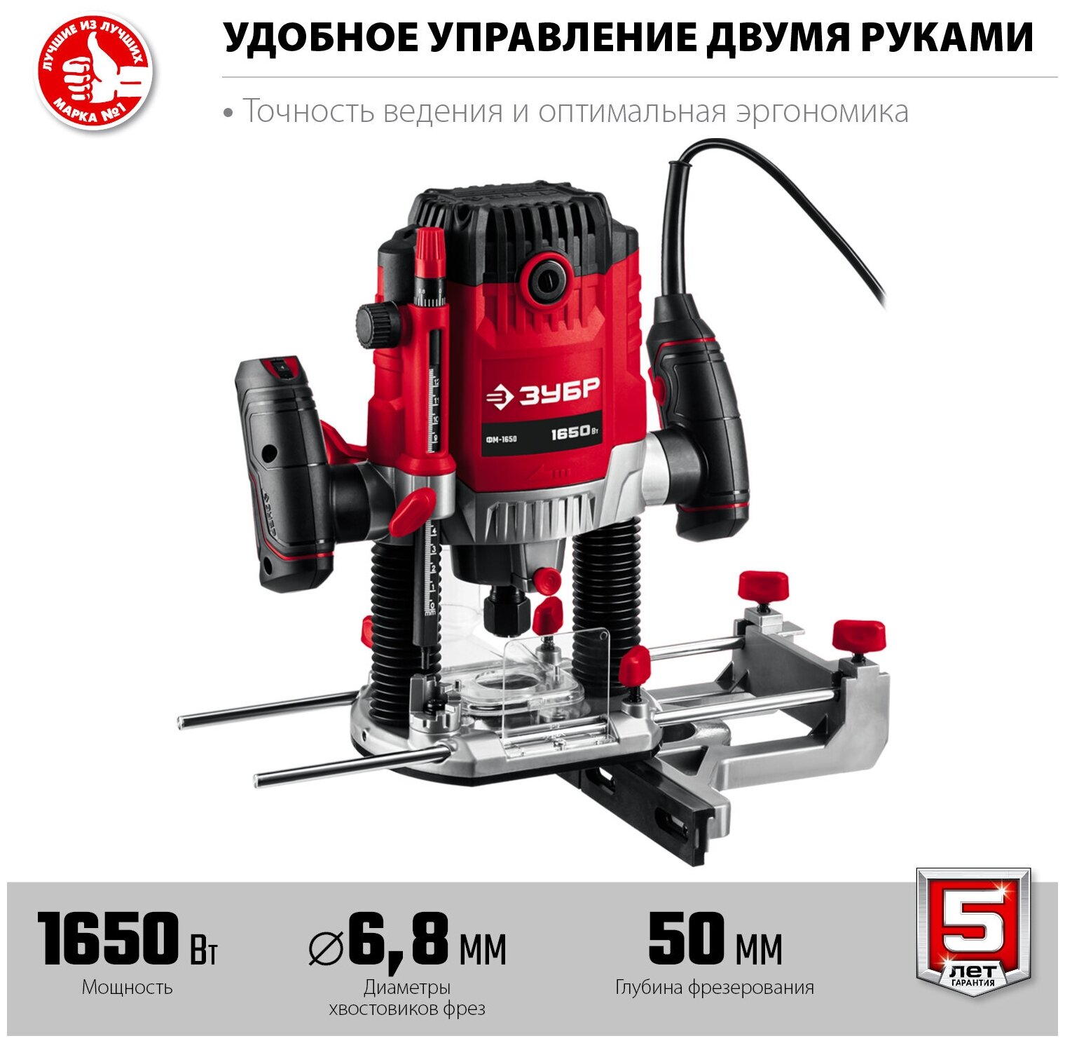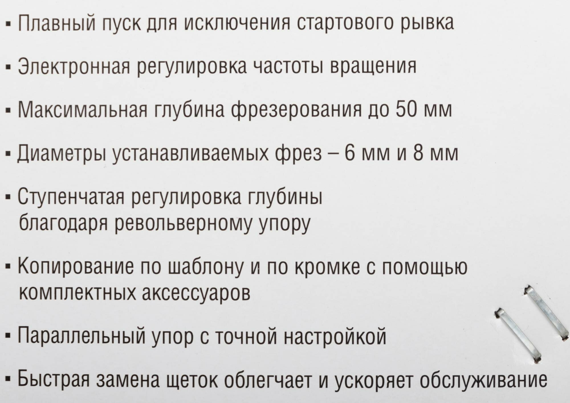 | Прочие особенности и свойства | Плавный пуск в ЗУБР ФМ-1650 – начало работы двигателя без стартового рывка,Электронная регулировка частоты вращения – выбора оптимальных настроек,Два размера цанг – использование широкого спектра расходного инструмента,Быстрая замена щеток – облегчает и ускоряет обслуживание,Револьверный упор со шкалой и ступенчатым изменением глубины – для предварительной установки глубины,Прозрачный щиток и патрубок для пылесоса – поддержание чистоты рабочего места,Комплектные аксессуары – копирование по шаблону и по кромке,Параллельный упор с точной настройкой – для ровного пиления вдоль кромки |
