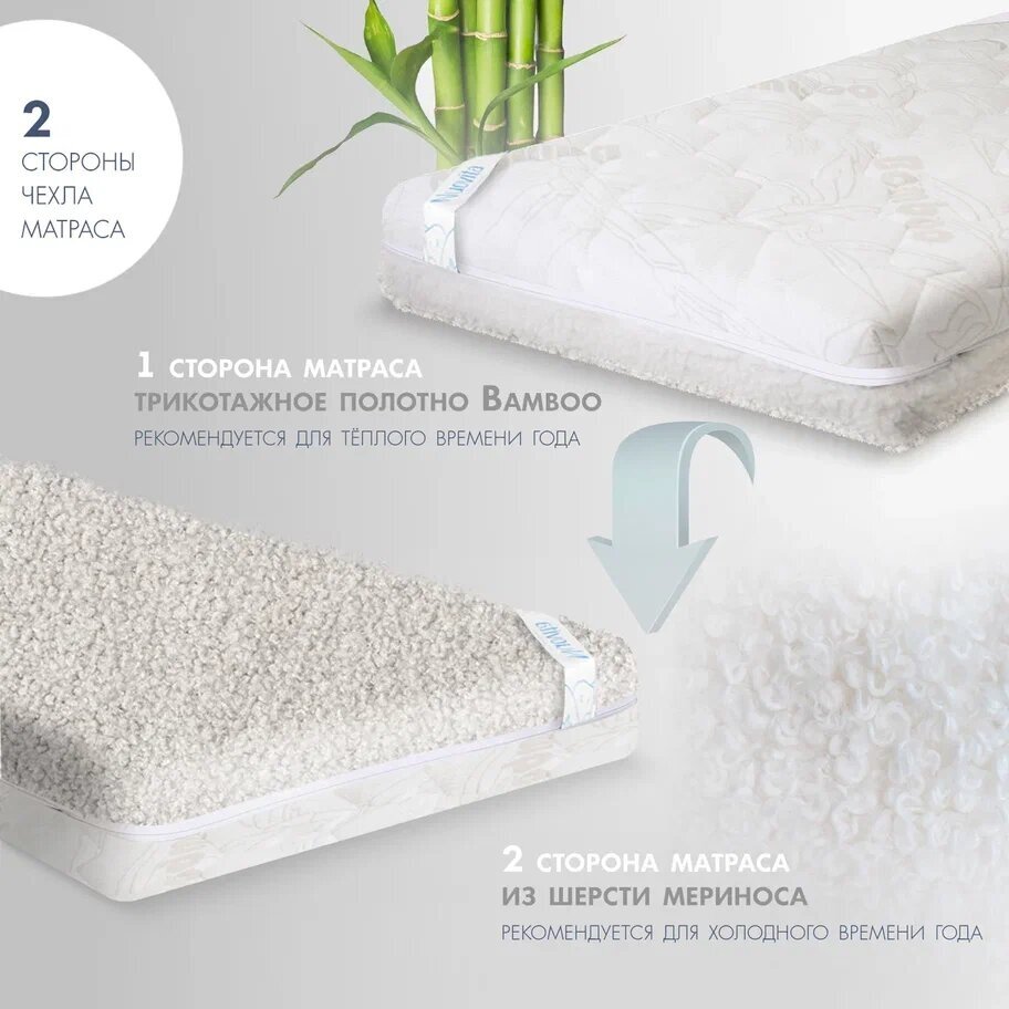 Чехол матраса является двусторонним, для зимы и для лета. Летняя сторона выполнена из трикотажного полотна Bamboo, стеганного на 200 граммовом синтепоне, а зимняя – из шерсти мериноса. Все составляющие элементы имеют свойство свободной циркуляции воздуха внутри матраса для обеспечения комфортного сна и долговечности изделия.