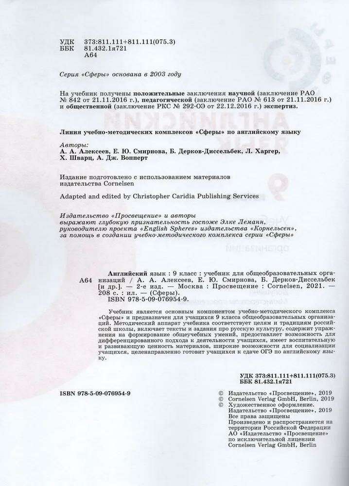 Алексеев. Английский язык. 9 класс. Учебник. (Смирнова Елена Юрьевна, Алексеев Александр Андреевич, Дерков Диссельбек Барбара); Просвещение Издательство, 2021