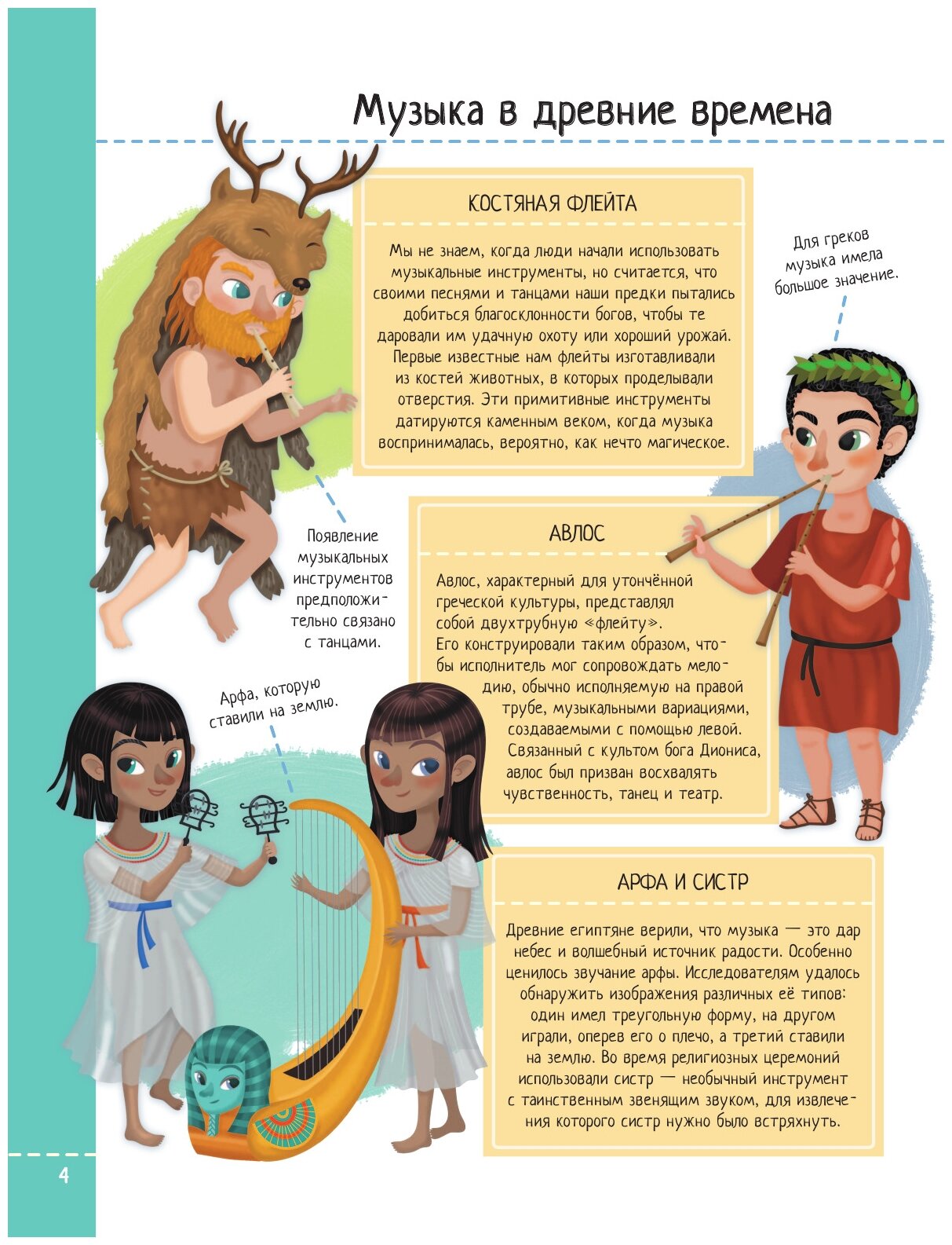 Информация "сконцентрированная", по сути. Можно узнать и о восприятии музыки и звуков органами человека, и о музыкальных терминах, и об исполнителях и композиторах, и о знаковых музыкальных творениях, и т.д. Информация сопрождается рисоваными иллюстрациями. Их стиль соответствует времени, о котором идет речь. -