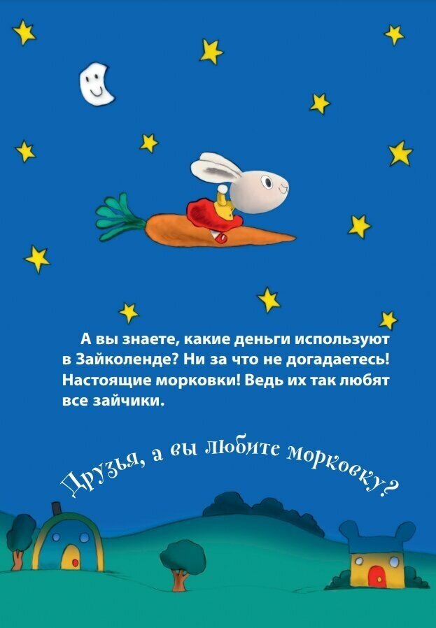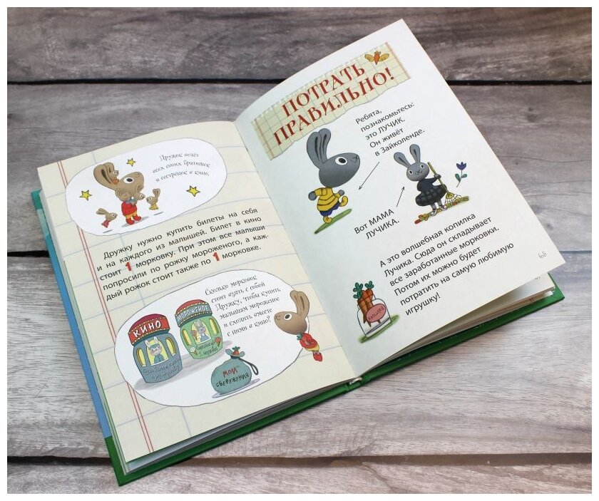 Как я рада, что заказала эту книгу! Было непонятно как объяснить ребенку про деньги и почему нельзя все игрушки забрать из магазина. Книга написана понятным языком и подходит для понимания 3-4 летним детям. Зайки на примерах денег-морковок рассказывают как зарабатываю деньги и зачем нужно их копить. Ребенку было интересно слушать и рассматривать картинки.