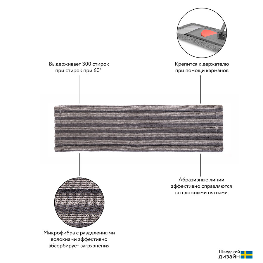Сменная насадка-тряпка из жесткой микрофибры предназначена для интенсивной влажной уборки. Практичный аксессуар с абразивными линиями эффективно справляется со сложными пятнами и твердой грязью, не царапая пол. Микрофибра подходит для всех типов напольных покрытий: кафеля, керамогранита, ламината, дерева и линолеума. Насадка-тряпка надежно крепится на флаундере, что препятствует ее соскальзыванию в процессе уборки. Микрофибра выдерживает до 300 стирок при температуре до 60