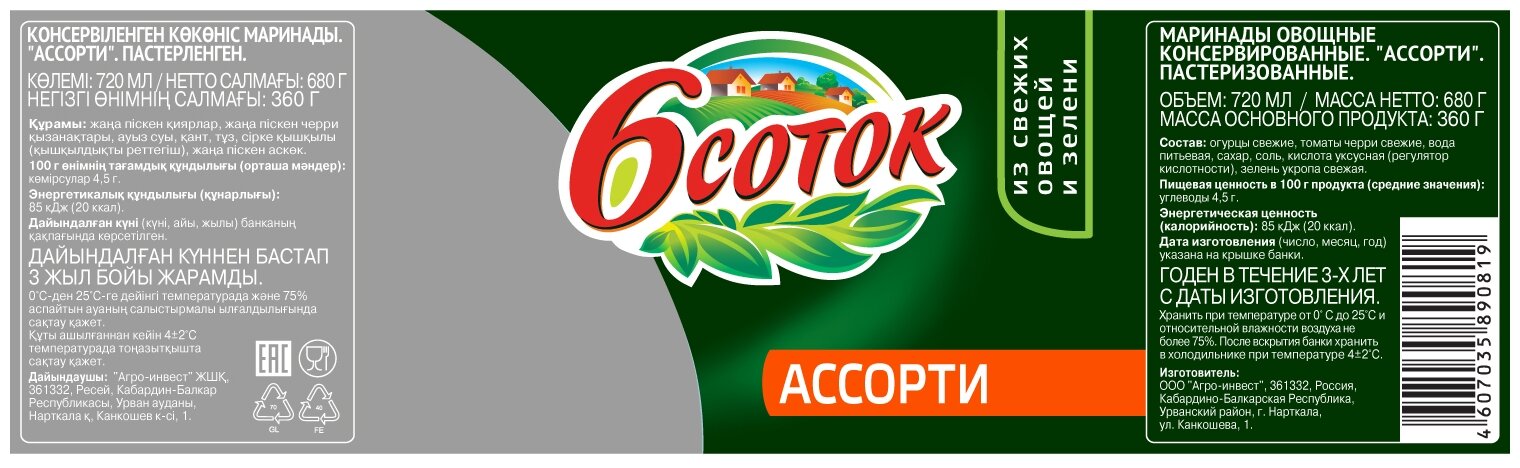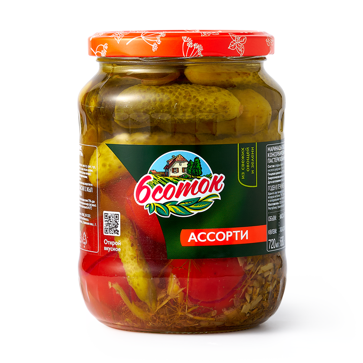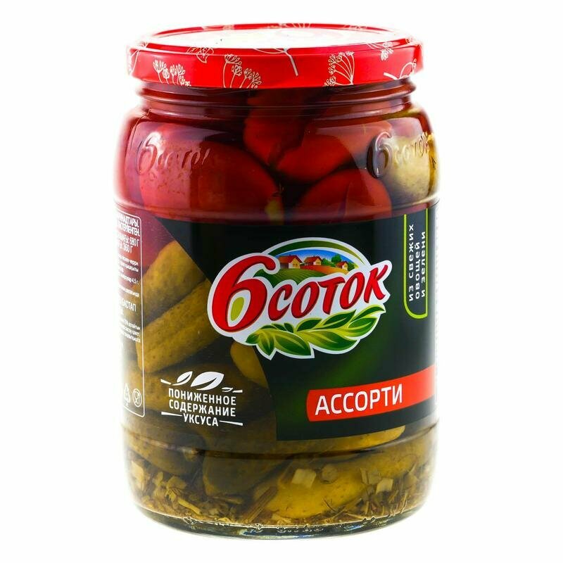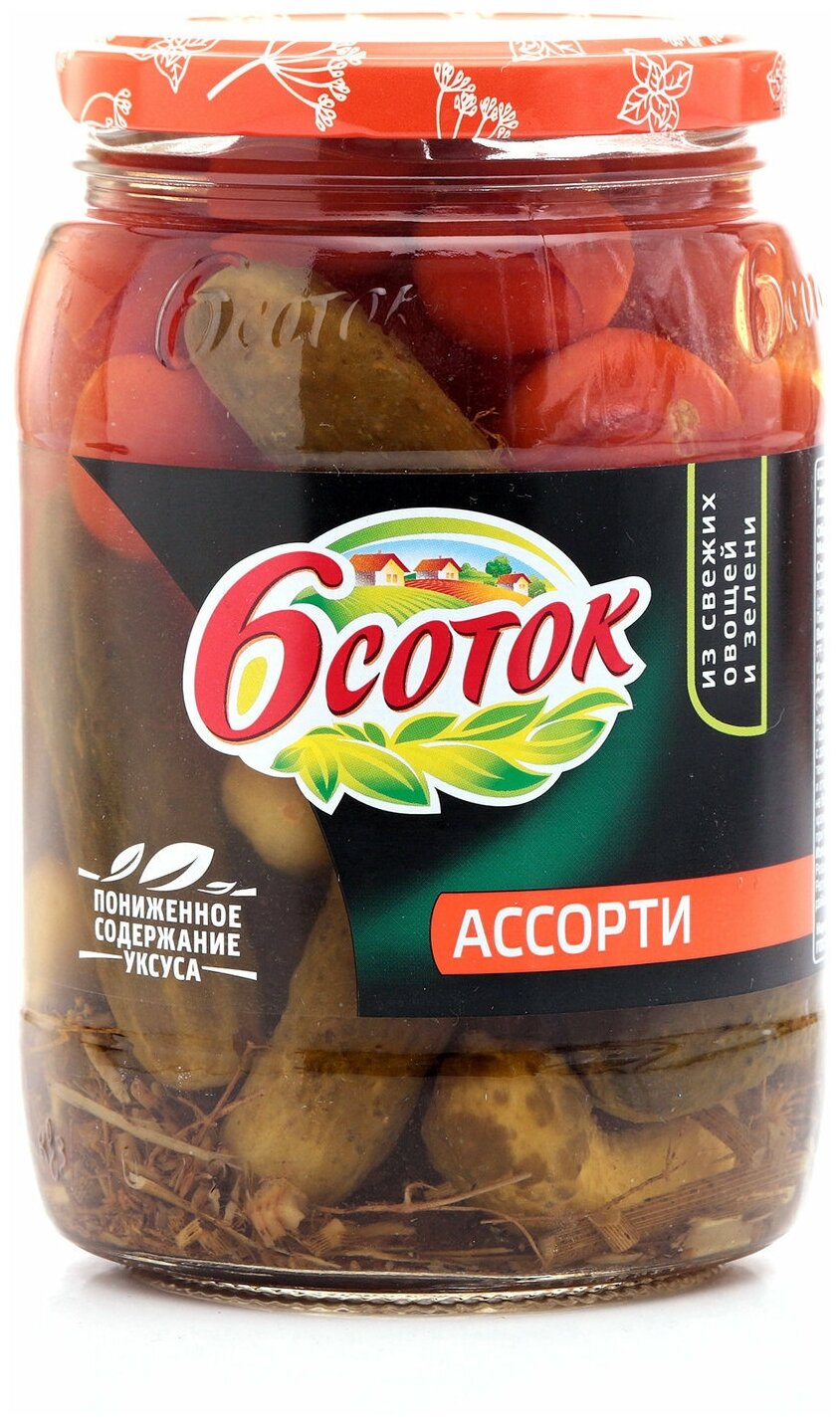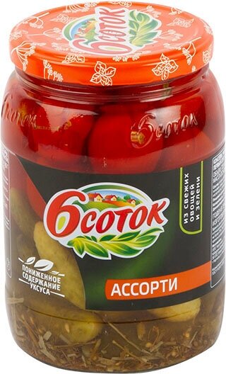 Ассорти 6 соток маринованные томаты черри и огурцы. Состав: томаты черри свежие, огурцы свежие, вода питьевая, сахар, соль, уксусная кислота (регулятор кислотности), пряности. Пищевая ценность на 100 г: углеводы - 4,5 г. Энергетическая ценность: 20 ккал/85 кДж. Хранить при температуре от 0°С до +25°С и относительной влажности воздуха 75%. Тара: стеклянная банка. Вес: 680 г. Страна производства: Россия.