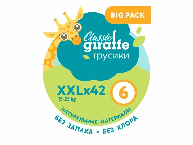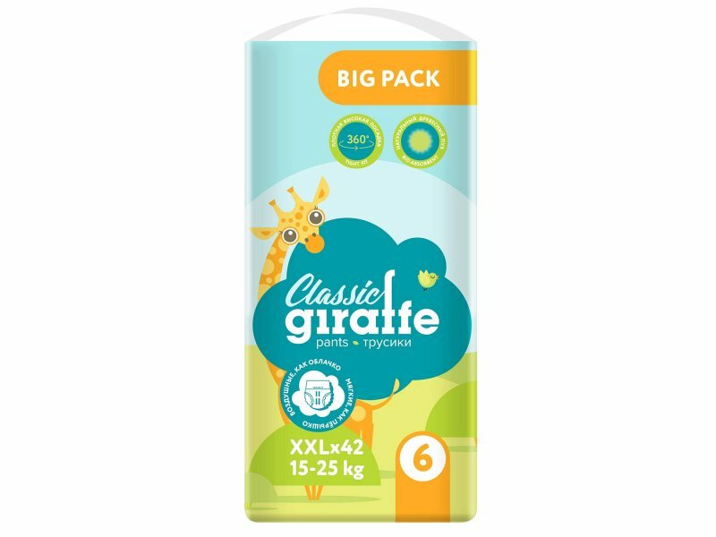 Подгузники-трусики Lovular Giraffe Classic XXL предназначены для детей весом от 15 до 25 кг. Примерно после четвёртого – пятого месяца малыш начинает изучать окружающий мир и учиться переворачиваться, ползать, сидеть. В таком возрасте обычные памперсы на липучке тяжело надеть на подвижного младенца. В этом случае на помощь приходят подгузники трусики для детей. Это невероятно удобная вещь, которую только могли придумать для деток! Наши универсальные трусики для мальчиков и девочек можно использовать как дневные подгузы. Мягкие прочные трусы для детей не протекают, впитывают до 400 мл жидкости и надёжно удерживает её внутри. Это обновлённая серия трусиков-подгузников Giraffe Classic TM Lovular. Мы добавили во внутренний слой на 23% больше биоразлагаемой натуральной целлюлозы. А поглощающий слой содержит натуральный древесный пух и впитывающее вещество–абсорбент. Благодаря дышащему материалу повышенной плотности происходит постоянный воздухообмен, который обеспечивает сухость и комфорт на всю ночь, в отличие от марлевых и многоразовых собратьев. Без парникового эффекта и холодной попы! Увеличенная высота бортиков, мягкие резиночки и мембранная ткань полностью исключает риск протекания по бокам. С нашей новинкой вам не понадобится детская присыпка и крем под подгузник. Одноразовое нижнее детское белье подходит для ежедневного пользования. Подгузнички приятны к телу, не вызывают дискомфорта и раздражения кожи. Такие средства личной гигиены нужны всегда: для подвижных игр на прогулке или дома, в путешествии, на пикнике. В них можно находиться на солнце, но они не подходят для плавания. Удобно положить в сумку для коляски, в органайзер на кроватку или хранить на пеленальном столике в детской комнате. Обратите внимание, что надпись Front находится спереди. При производстве предметов гигиены, мы используем только безопасные, высококачественные гипоаллергенные материалы, которые проходят тщательную проверку в лаборатории. Вся наша продукция протестирована и имеет сертификаты качества. В нашем магазине есть большой запас трусиков подгузников мегапак. Переходите в наш бренд, выбирайте товары для новорождёных, мам и беременных женщин. Состав: основа — распушенная целлюлоза, нетканые материалы с целлюлозными волокнами, дополнительно — влагопоглощающее вещество. Хранить в сухом и недоступном для детей месте, вдали от прямых солнечных лучей. Во избежание удушья, порванные или использованные трусики-подгузники необходимо немедленно выбрасывать. Срок годности – 3 года.