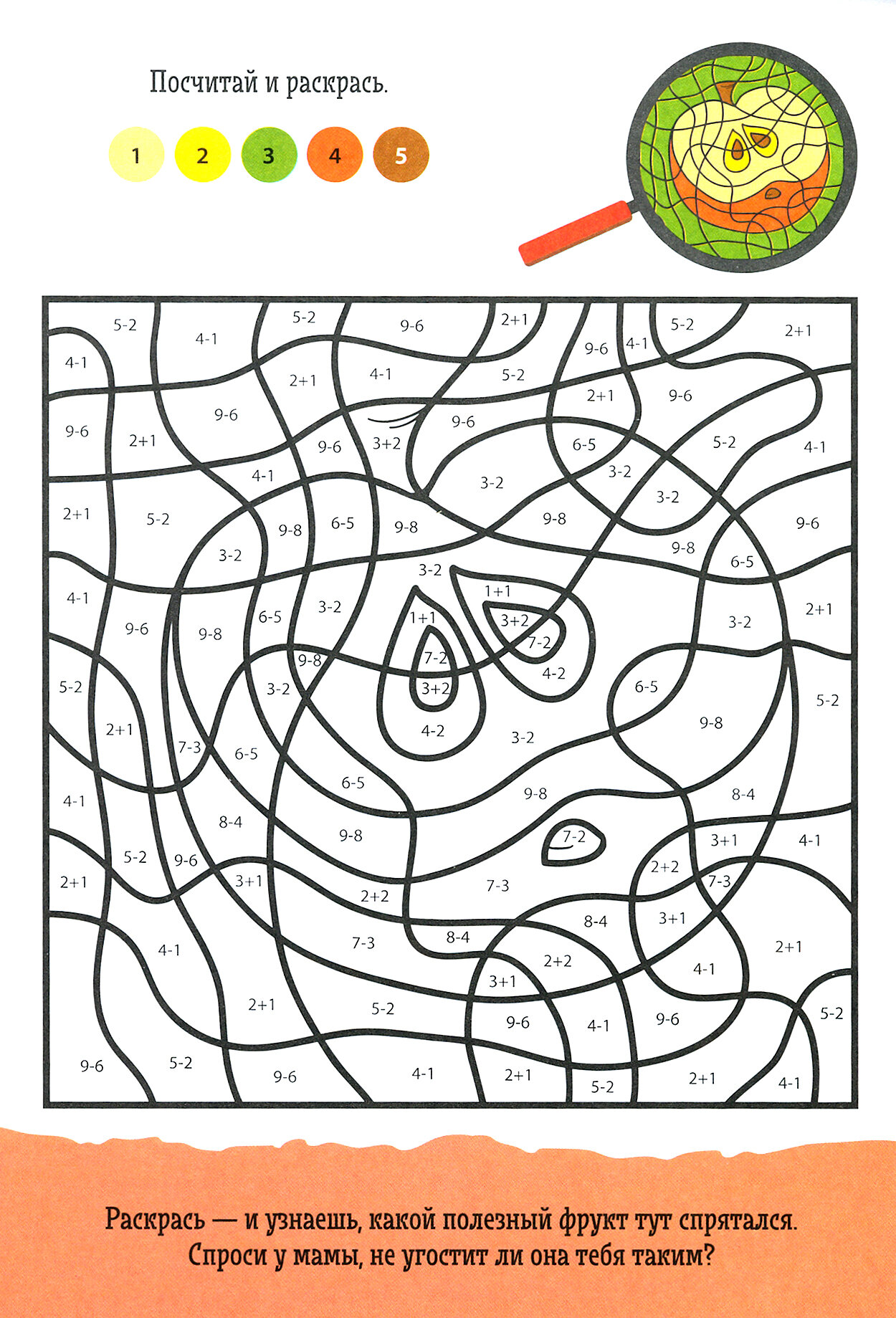 Книжка в виде блокнота. 16 картинок, примеры не сложные, до первого десятка. Картинка разбита на большое количество областей, в областях мелкие цифры с примерами. Почему серия «возьми с собой в дорогу»? В дороге такой мелкий шрифт неудобно читать. Картинка где-то 14х14 см, а областей, и соответственно примеров, где-то 60. Но примеры легкие.