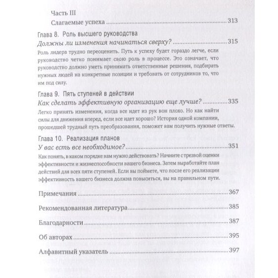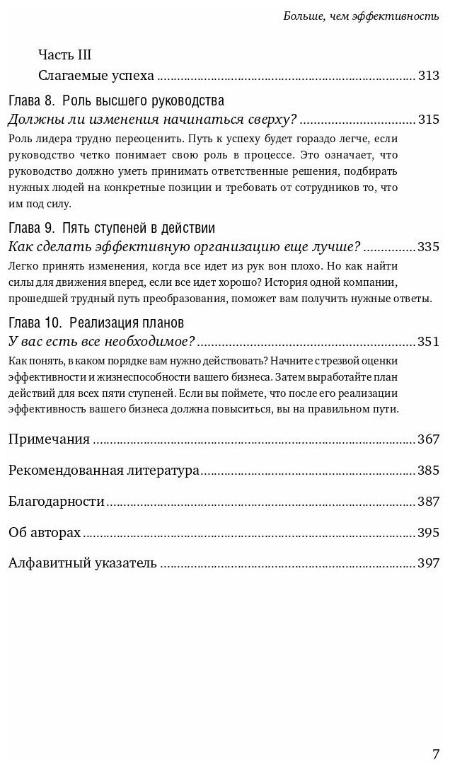 О чем книга «Больше, чем эффективность: Как самые успешные компании сохраняют лидерство на рынке»Объясняет, в чем кроется суть по-настоящему эффективного управления компанией и организацией. И то, как провести масштабные изменения в менеджменте компаний с учетом результатов опросов более 6800 руководителей высшего звена на тему реорганизации предприятий.