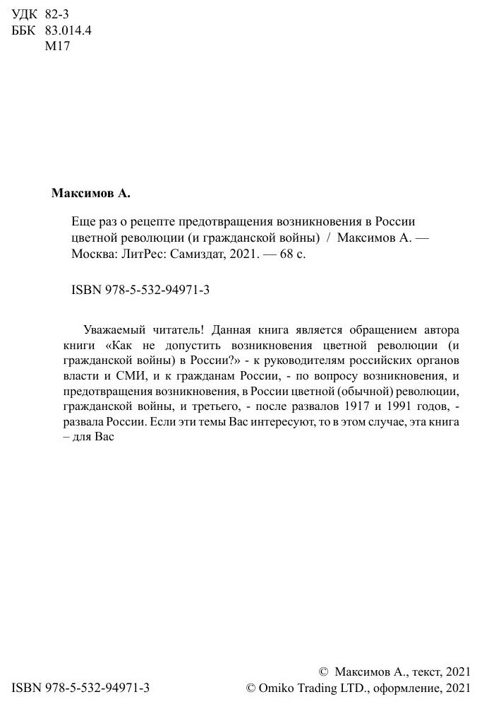 На сегодняшний день товар «Книга: Еще раз о рецепте предотвращения возникновения в России цветной революции (и гражданской войны) (Алексей Максимов); Автор, 2021» можно купить с кешбеком в 1 магазине: ЛитРес