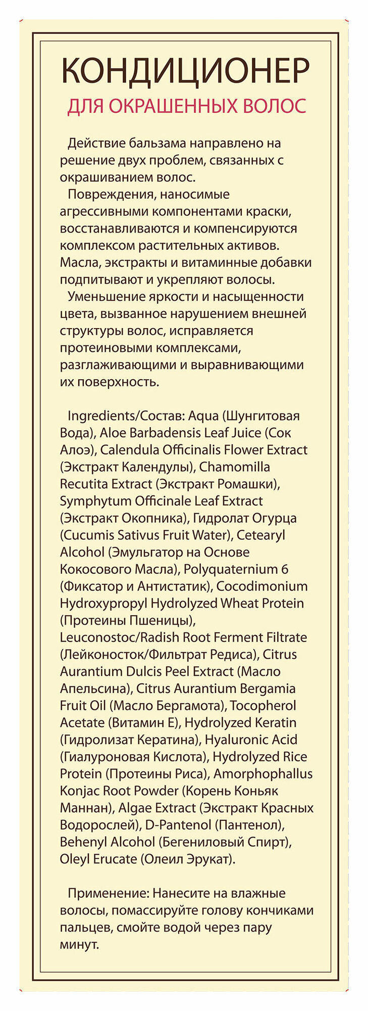 | Состав | aqua (шунгитовая вода), aloe barbadensis leaf juice (сок алоэ), calendula officinalis flower extract (экстракт календулы), chamomilla recutita extract (экстракт ромашки), symphytum officinale leaf extract (экстракт окопника), гидролат огурца (cucumis sativus fruit water), cetearyl alcohol (эмульгатор на основе кокосового масла), polyquaternium 6 (фиксатор и антистатик), cocodimonium hydroxypropyl hydrolyzed wheat protein (протеины пшеницы), leuconostoc/radish root ferment filtrate (лейконосток/фильтрат редиса), citrus aurantium dulcis peel extract (масло апельсина), citrus aurantium bergamia fruit oil (масло бергамота), tocopherol acetate (витамин е), hydrolyzed keratin (гидролизат кератина), hyaluronic acid (гиалуроновая кислота), hydrolyzed rice protein (протеины риса), amorphophallus konjac root powder (корень коньяк маннан), algae extract (экстракт красных водорослей), d-pantenol (пантенол), behenyl alcohol (бегениловый спирт), oleyl erucate (олеилэрукат) |