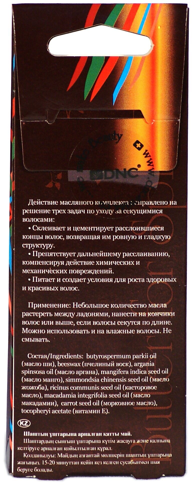 Действие масляного комплекса (масла Ши, аргана, манго, жожоба, касторовое, макадамии, морковное, а также пчелиный воск и витамин Е) направлено на решение трех задач по уходу за секущимися волосами: Склеивает и цементирует расслоившиеся концы волос, возвращая им ровную и гладкую структуру. Препятствует дальнейшему расслаиванию, компенсируя действие химических и механических повреждений. Питает и создает условия для роста здоровых и красивых волос.