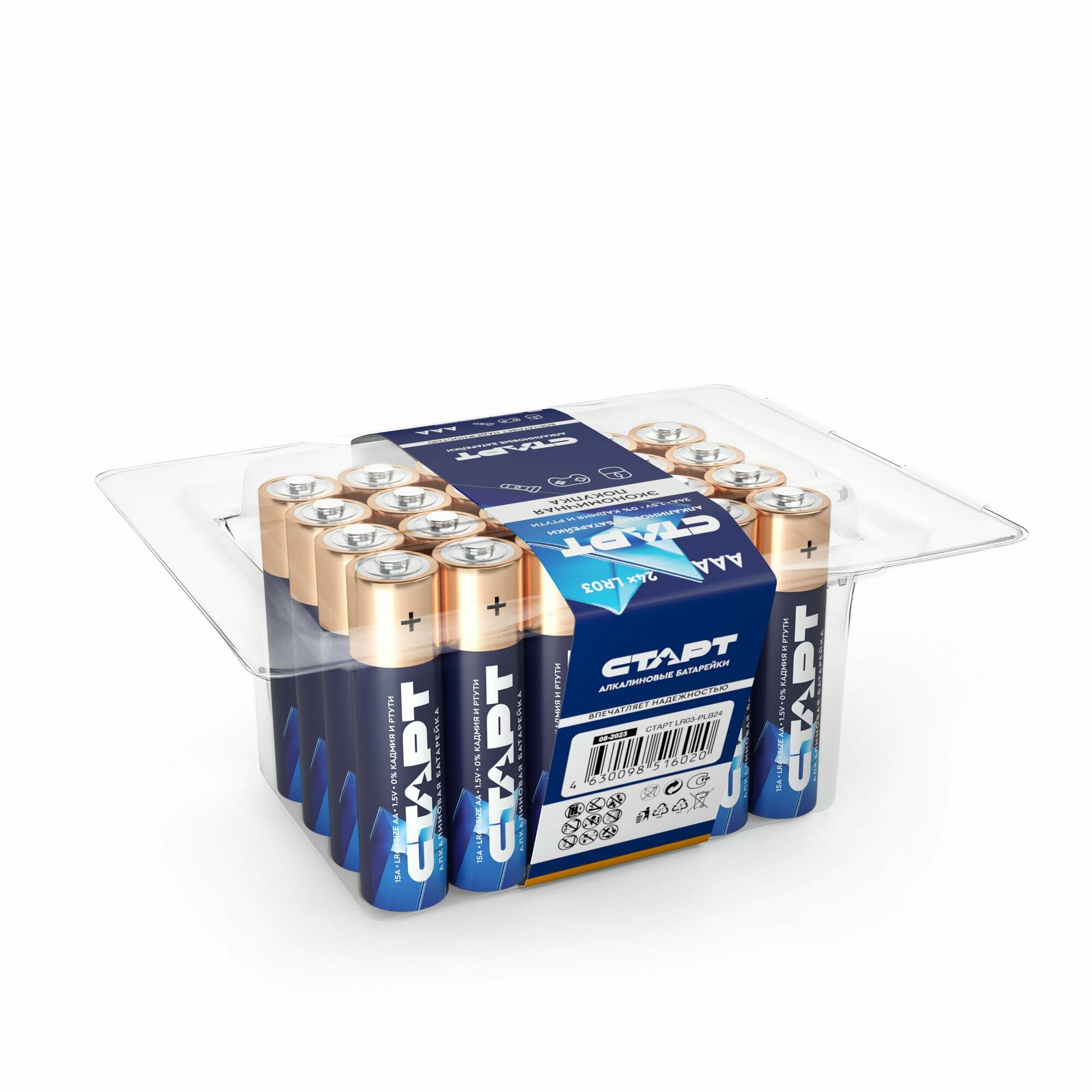 СТАРТ LR03-PLB24 /480 Щелочные батарейки «Старт» в новом эргономичном боксе Преимущества Щелочные батарейки «Старт» типоразмера ААА «мизинчиковые» рассчитанных на работу в устройствах с большим потреблениям энергии: в медицинских приборах, туристических фонарях, радиоуправляемых детских игрушках, автосигнализациях. Новую линейку отличает удобная и функциональная упаковка.Комплект батареек помещен в прозрачный компактный бокс, который очень удобен в пользовании и хранении. Батарейки в такой упаковке не рассыпаются. Бокс легко открывается и закрывается. Отличный вариант для транспортировки и хранения батареек дома, в офисе, машине. Пластиковый корпус защитит батарейки от негативного внешнего воздействия, продлевая срок службы. Комплект батареек в боксе содержит 24 элемента питания. Такое количество поможет зарядить энергией сразу несколько устройств. Удобно и экономно хранить про запас. Это намного дешевле, чем приобретать батарейки несколько раз по одной штуке. Безопасность Щелочные батарейки «Старт» абсолютно безопасны. Корпус герметичен.Элементы питания запрещается самостоятельно разбирать, деформировать корпус, бросать в огонь. Использованные батарейки не выбрасывайте вместе с другим бытовым мусором. Отслужившие свой срок элементы питания следует отнести в специальные пункты. Контейнеры для сбора батареек установлены во многих торговых центрах. Технические параметры Вид: щелочныеТипоразмер: LR03 AAА («мизинчиковые»)Рабочее напряжение: 1,5 ВТемпература эксплуатации: от -18 до +50°СТемпература хранения: от -30 до +45°С при относительной влажности до 65%Количество батареек в упаковке: 24 шт.Срок годности, лет: 10