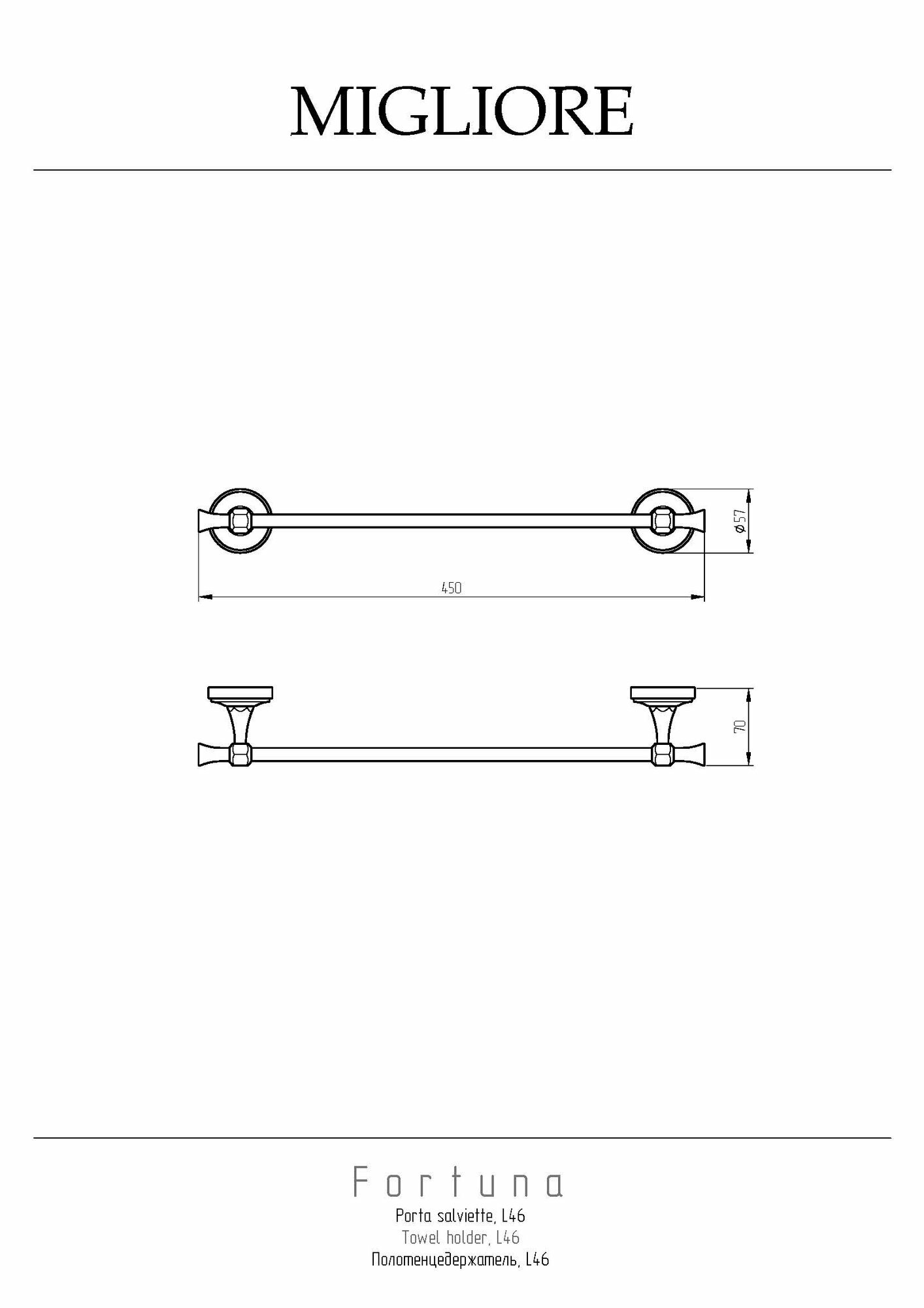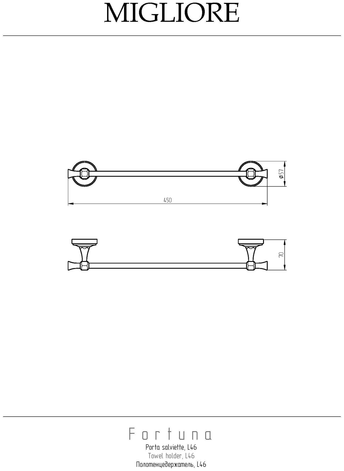FORTUNA Полотенцедержатель L46 см, золотоПолотенцедержатель серии FORTUNA бренда MIGLIORE - один из необходимых аксессуаров для ванной комнаты. Его длина 46 см, что позволит разместить его даже на небольшом пространстве. Используется, как правило, для полотенца небольшого размера. Также удобно разместить рядом с биде. Изделие выполнено из высококачественной латуни и имеет гальваническое покрытие золотом 24 карата. Внимание: золотое покрытие очень деликатное и для ухода рекомендуется использовать чистящее средство бренда MIGLIORE для смесителей и аксессуаров с деликатными покрытиями бронза, золото, медь и протирать мягкой ветошью.Внимание: золотое покрытие очень деликатное и для ухода рекомендуется использовать чистящее средство бренда MIGLIORE для смесителей и аксессуаров с деликатными покрытиями бронза, золото, медь и протирать мягкой ветошью.Материал: Латунь; Оснащение: крепления (шурупы)