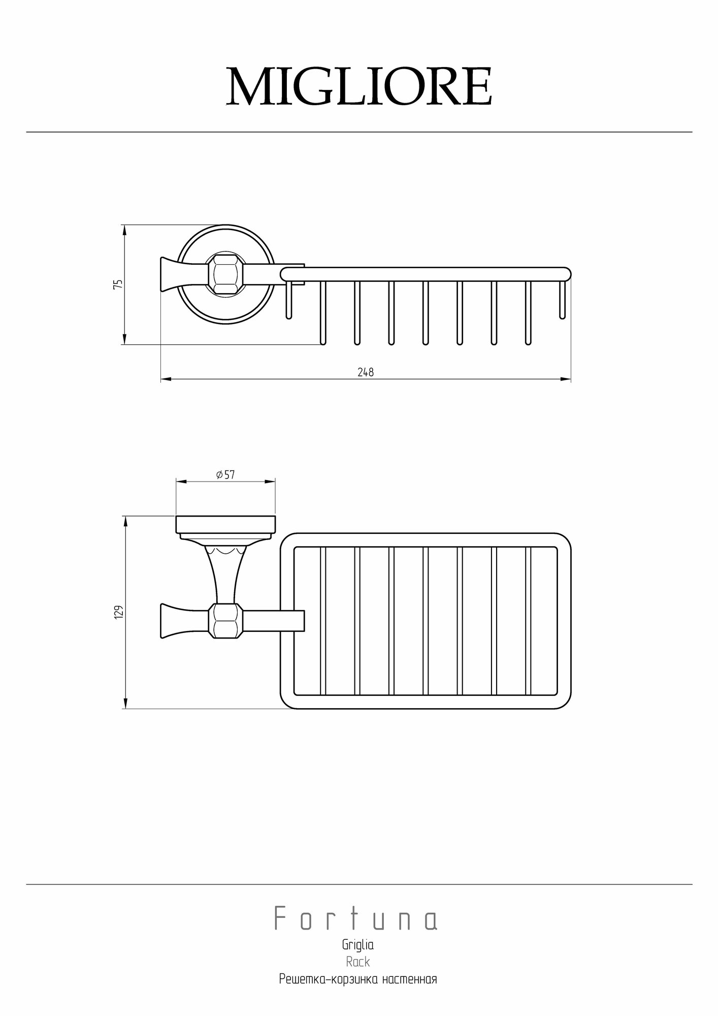 Решетка-корзинка настенная серии FORTUNA бренда MIGLIORE - это удобный аксессуар для душевой кабины. На решетке не скапливается вода и мыло не будет размокать. Изделие выполнено из высококачественной латуни и имеет гальваническое покрытие золотом 24 карата. Внимание: золотое покрытие очень деликатное и для ухода рекомендуется использовать чистящее средство бренда MIGLIORE для смесителей и аксессуаров с деликатными покрытиями бронза, золото, медь и протирать мягкой ветошью.