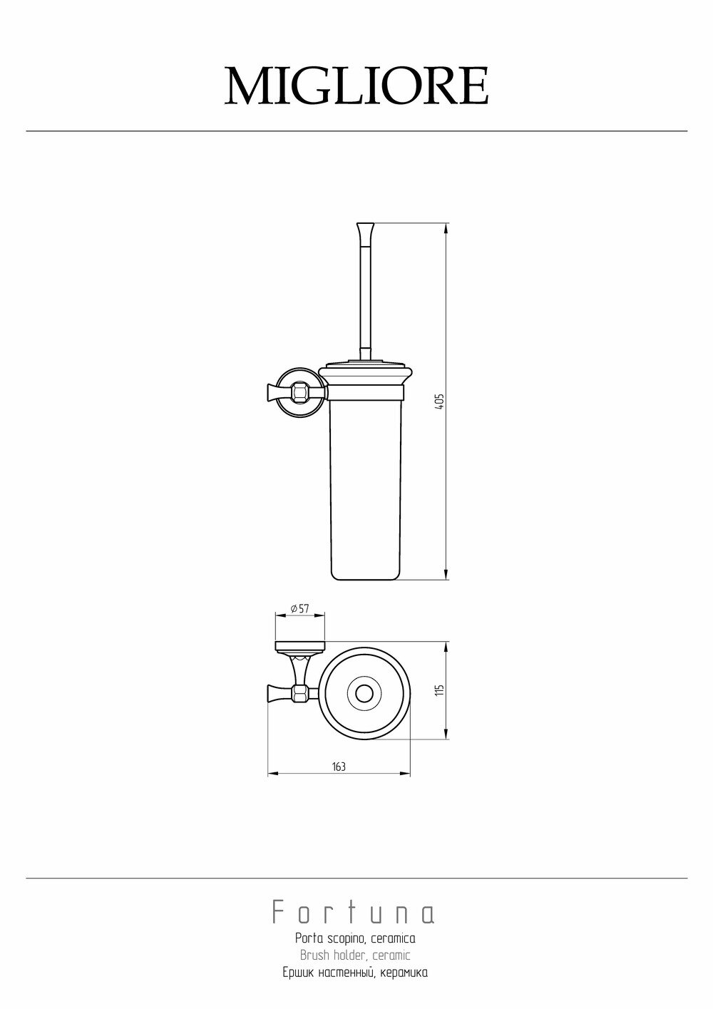 Настенный ершик серии FORTUNA бренда MIGLIORE - это функциональный аксессуар для ванной комнаты. Белая керамика классической формы выглядит эстетично и легко моется, а размещенный на стене ерш не мешает при уборке пола. Изделие выполнено из высококачественной латуни и имеет гальваническое покрытие золотом 24 карата. Внимание: золотое покрытие очень деликатное и для ухода рекомендуется использовать чистящее средство бренда MIGLIORE для смесителей и аксессуаров с деликатными покрытиями бронза, золото, медь и протирать мягкой ветошью.