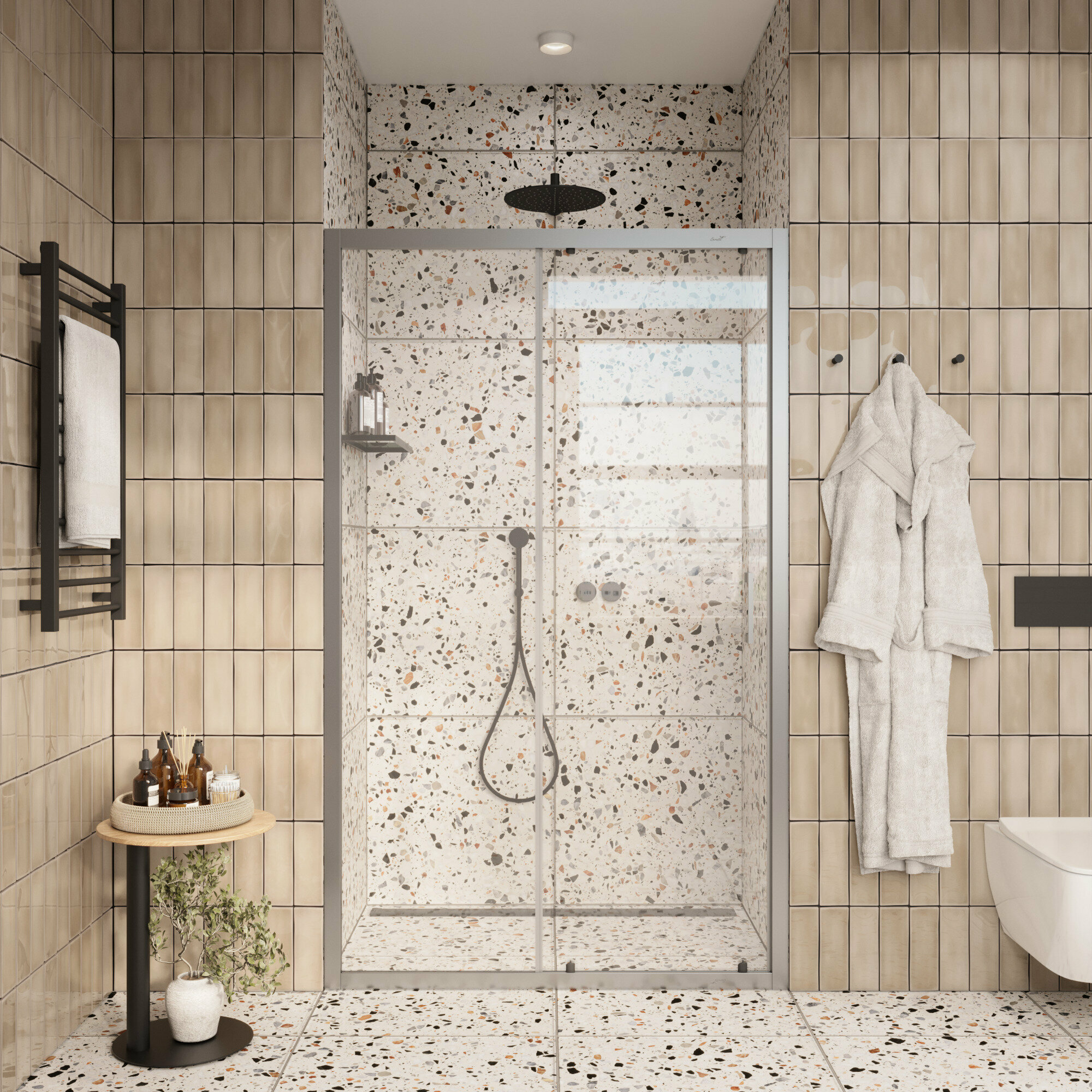 Раздвижная дверь на двойных металлических хромированных роликах Doppi ходит плавно и бесшумно. Алюминиевый полированный хромированный профиль и ручка из чистой стали не деформируются при высокой влажности и смене температуры, устойчивы к образованию коррозии.
