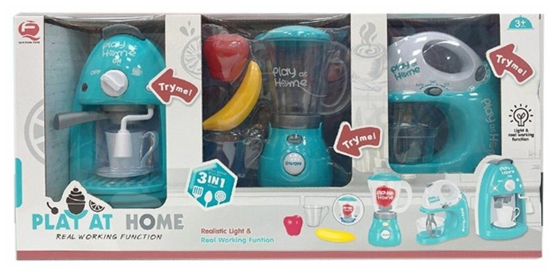 Набор игрушечной техники познакомит маленькую хозяюшку с первыми предметами быта! Все игрушки, представленные в комплекте, выполнены очень реалистично! Комплектация: - Кофеварка с чашкой. В кофеварку можно наливать воду, будет литься, если повернуть включатель). Игрушка воспроизводит реалистичные звуки и мелодии, индикатор на корпусе светится красным; - Блендер с яблоком, бананом и чашкой. Блендер воспроизводит жужжащий звук, лампочка на корпусе загорается жёлтым; - Миксер с чашей. Венчики миксера крутятся. Для работы функций игрушек потребуется 6 батареек типа АА на 1,5 V (по 2 на каждый предмет). Элементы питания входят в комплект в демонстрационных целях. Для наилучшей производительности рекомендуется заменить их на новые. Размеры (ДхШхВ) кофеварки: 14х11х23 см, блендера: 12х9х20 см, миксера: 18х9х18,5 см. Материал изготовления: пластмасса. Рекомендованный возраст: 3 года +